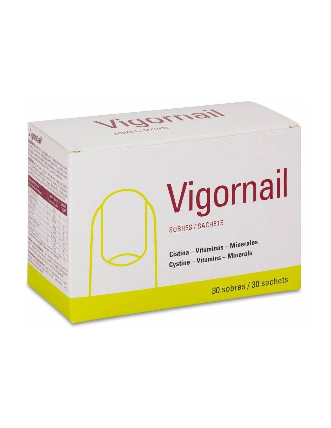 Vigornail es una combinación equilibrada de elementos esenciales para la nutrición de las uñas, en sobres de agradable sabor a naranja, sin azúcar, estabilizadores ni colorantes. Contiene, entre otros ingredientes, L-cistina y zinc. Una ingesta adecuada de zinc es uno de los factores que ayudan a mantener las uñas en condiciones normales. La L-cistina es un aminoácido azufrado constitutivo de la queratina.