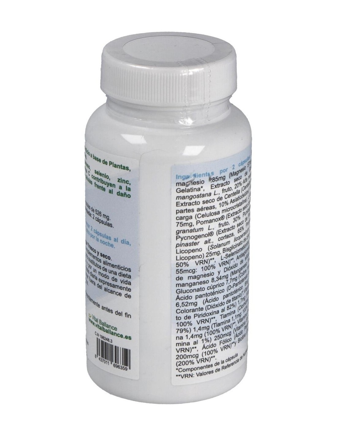 Bisglicinato de Magnesio, Agente de recubrimiento (gelatina y colorante dióxido de Titanio), Extracto seco de Garcinia (Garcinia mangostana L., fruto), Extracto seco de Centella (Centella asiatica (L.) urb., partes aereas), Agente de carga (celulosa microcristalina), L-arginina aspartato, Pomanox® (extracto seco de Granada (Punica granatum L., fruto), Pycnogenol® (extracto seco de Pino marino (Pinus pinaster ait., corteza), Licopeno (Solanum licopersicum L., fruto), Bisglicinato de Zinc, Seleniometionina, antiaglomerantes (estearato de Magnesio y dióxido de Silicio), Gluconato de Manganeso, Gluconato cúprico, Ácido pantoténico (D-pantotenato cálcico), Vitamina B6 (Clorhidrato de Piridoxina) Vitamina B1 (Clorhidrato de Tiamina), Vitamina B12 (Cianocobalamina), Vitamina B2 (Riboflavina), ácido fólico (Ácido pteroilmonoglutámico) y Biotina (D-biotina).