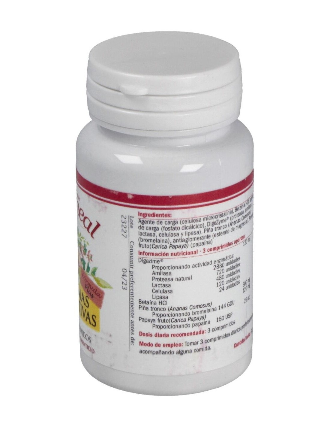 Ingredientes:Agente de carga (celulosa microcristalina), Betaína HCl, agente de carga (fosfato dicálcico), DigeZyme® (proteasa, amilasa, lactasa, celulasa y lipasa), Piña tronco (Ananas Comosus) (bromelaina), antiaglomerante (esterato de magnesio), Papaya fruto (Carica Papaya) (papaína).Modo de empleo:Tomar 3 comprimidos al día.Presentación:Envase de 100 comprimidos.Recomendaciones y advertencias:No contiene gluten.