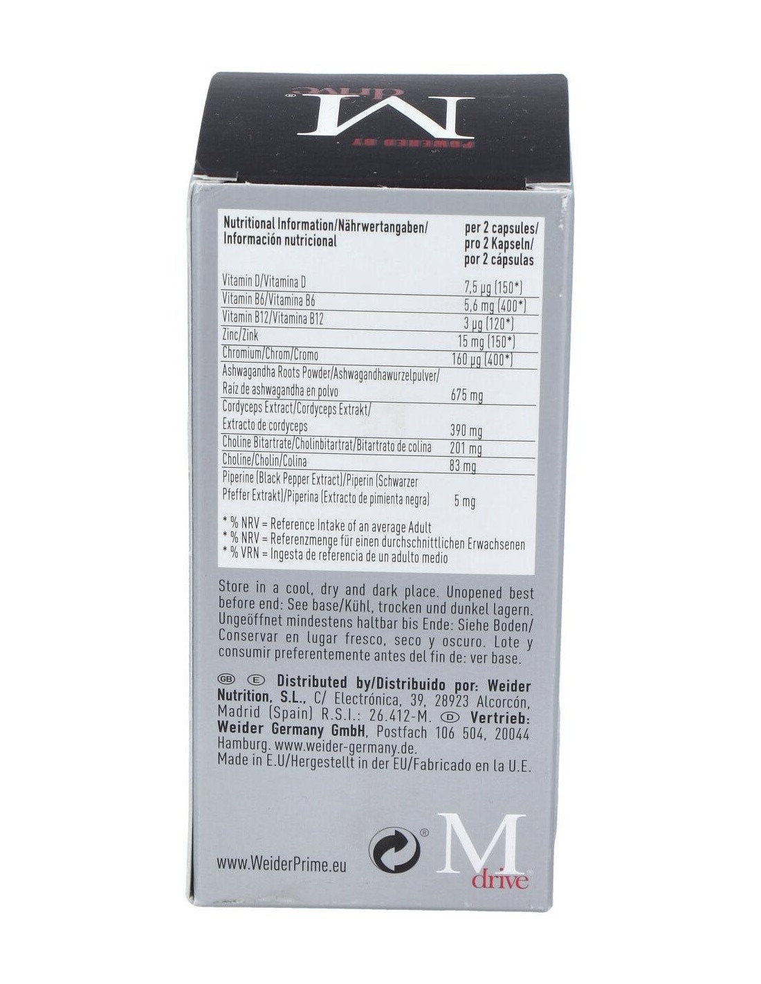 RAÍZ DE ASHWAGANDHA EN POLVO (WHITANIA SOMNIFERA)(CONTIENE LECHE), EXTRACTO DE CORDYCEPS (CORDYCEPS SINENSIS), GELATINA, BITARTRATO DE COLINA, ANTIAGLOMERANTES: E341,E551; CITRATO DE ZINC, CLORURO DE CROMO, VITAMINA B6 (PIRIDOXINA CLORHIDRATO), AGENTE DE CARGA: E470B; VITAMINA B12 (CIANOCOBALAMINA), PIPERINA (EXTRACTO DE PIMIENTA NEGRA), VITAMINA D3 (COLECALCIFEROL).