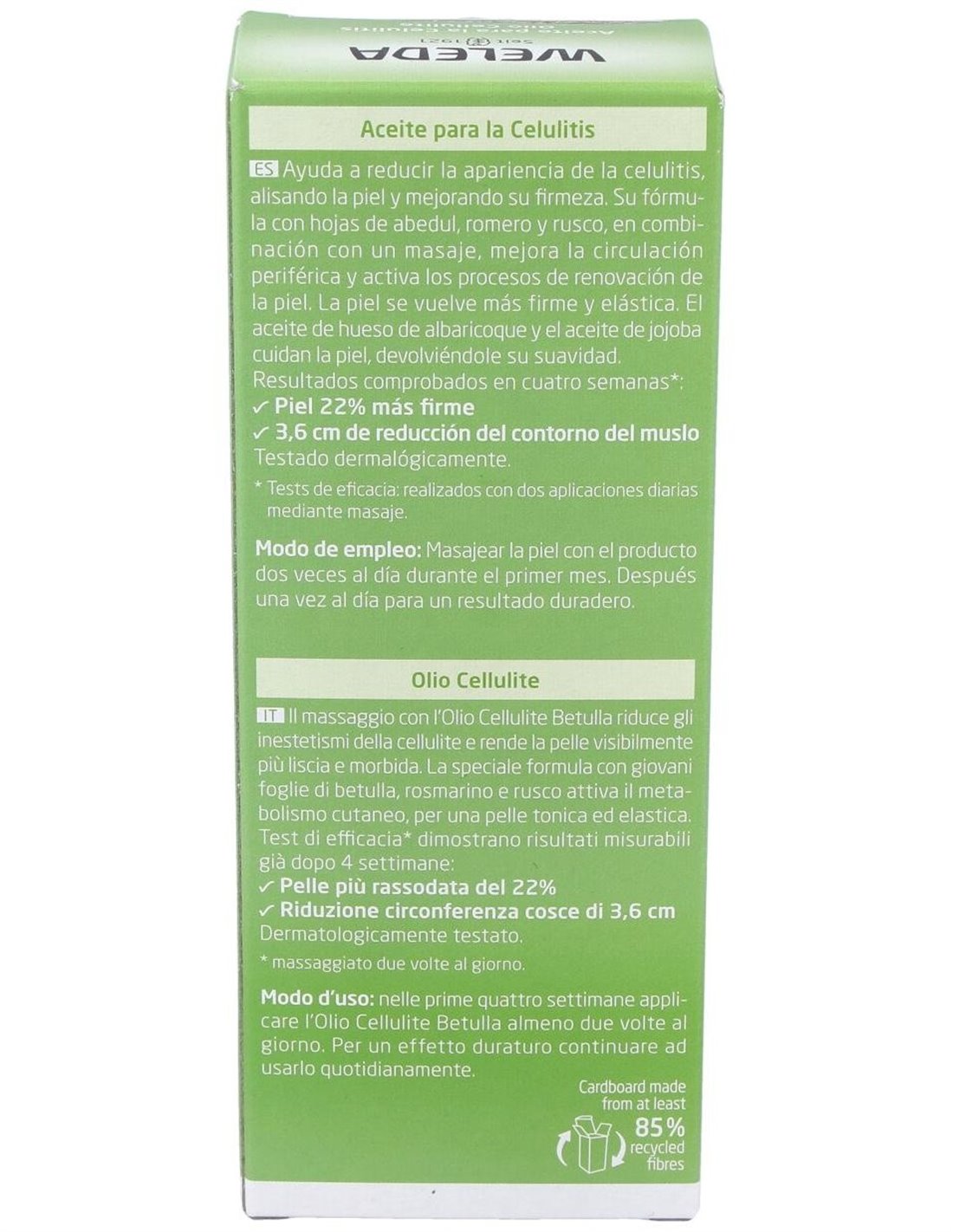 Acción anticelulítica y reductora. Su avanzada fórmula con extractos biológicos de hojas jóvenes de abedul, de romero y de rusco activa el metabolismo