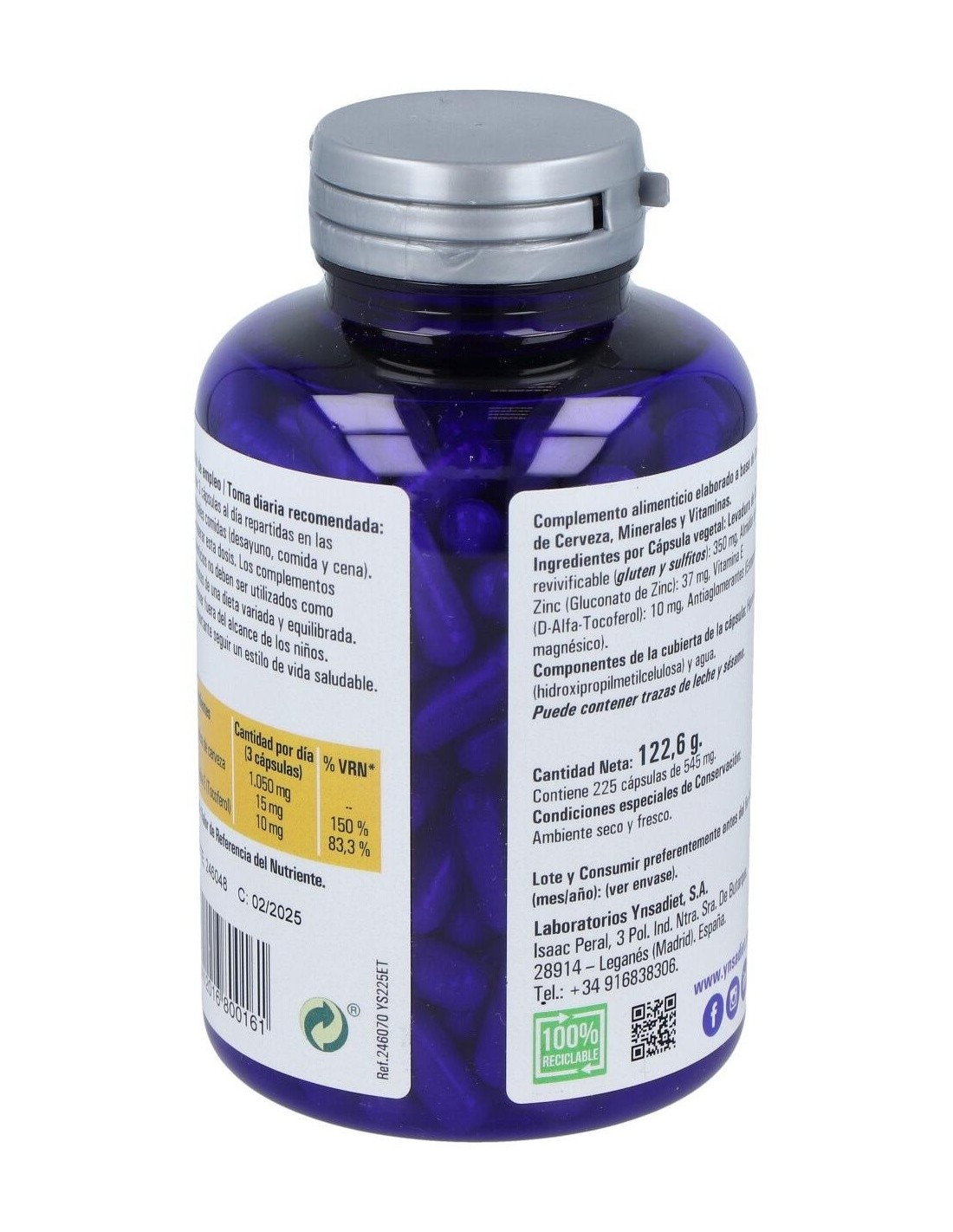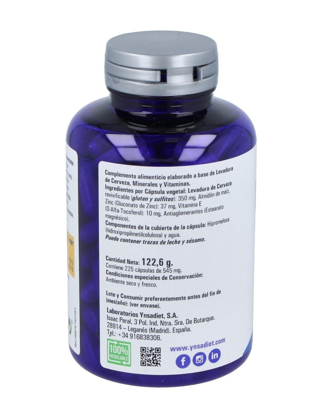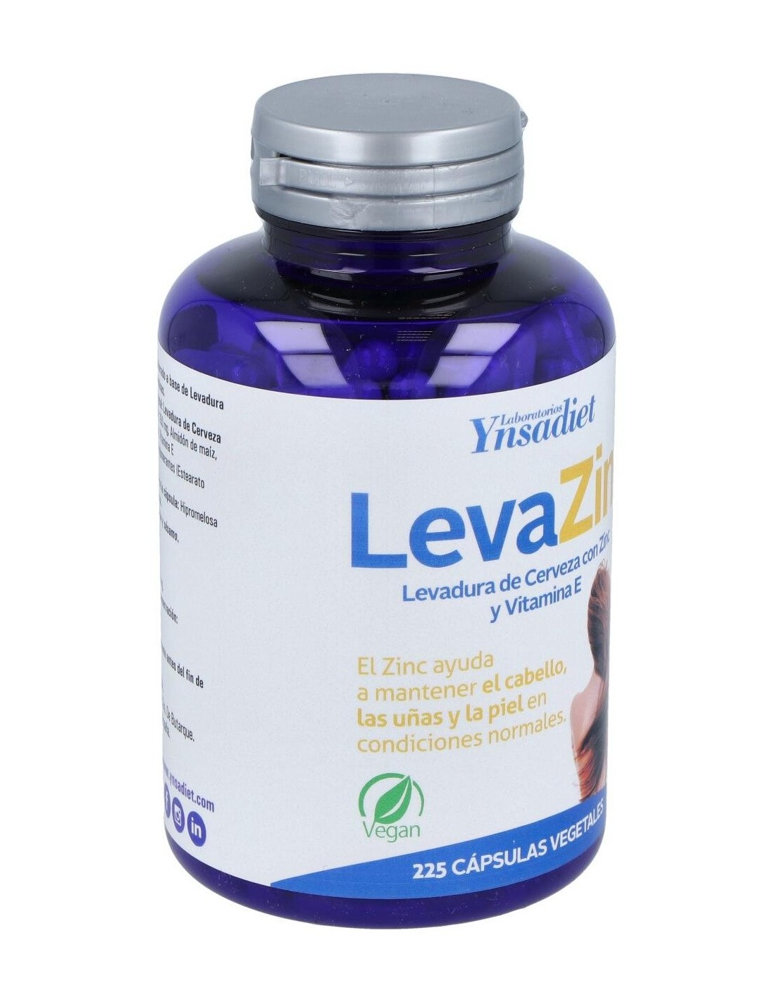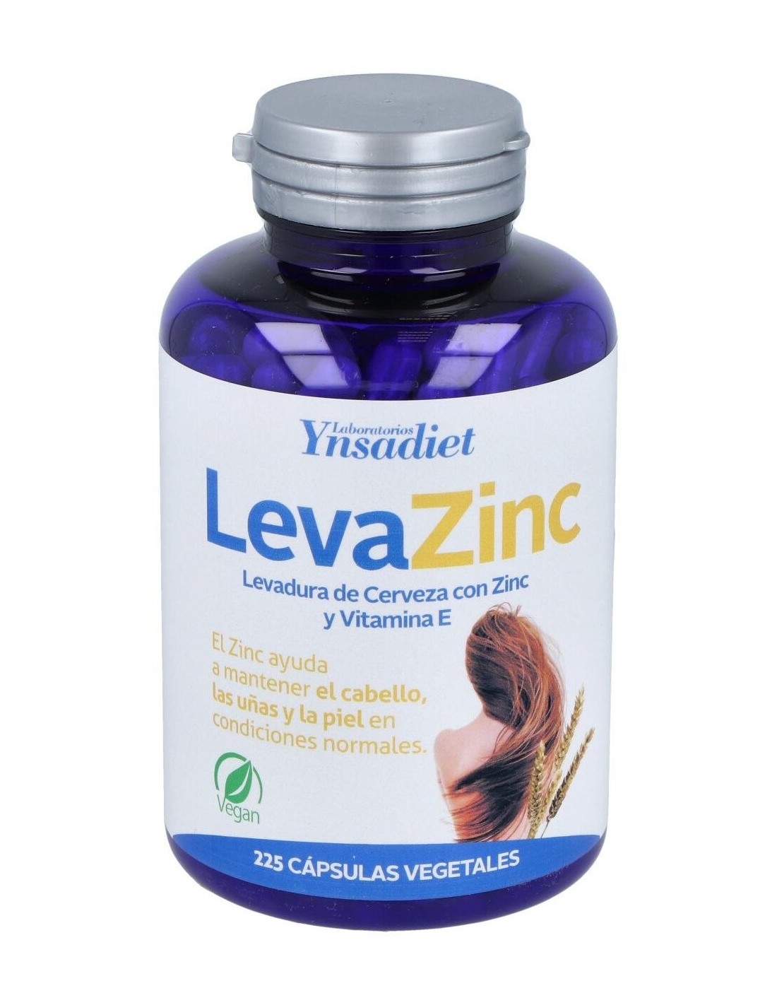 Ynsadiet Leva-Zinc es un complemento alimenticio de levadura de cerveza rico en zinc que contribuye a mantener el cabello, las uñas y la piel en condiciones normales. Aporta vitaminas del grupo B y minerales como fósforo, hierro, calcio, sílice, zinc y cobre.