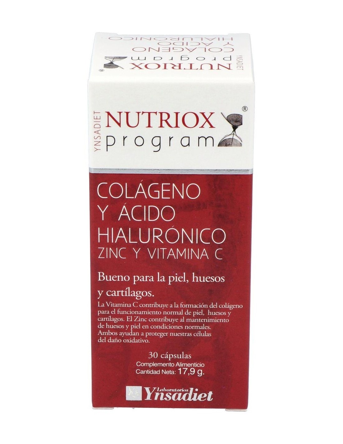 Ynsadiet colágeno + ácido hialurónico Nutriox es un complemento alimenticio que combina colágeno y ácido hialurónico (junto a zinc y vitamina C, para mejorar su absorción) para favorecer el estado óptimo de la piel y contribuir a frenar el envejecimiento celular.