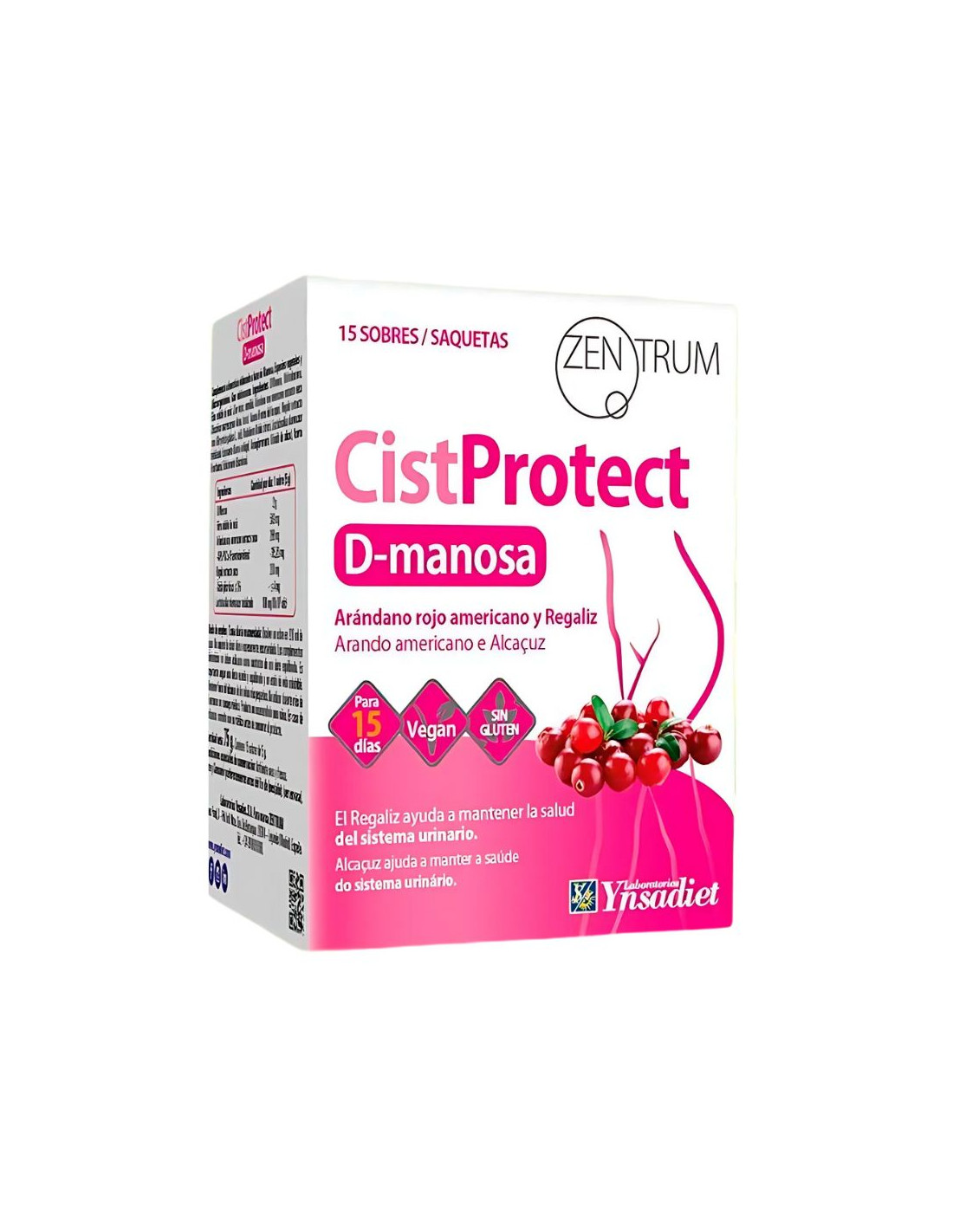 D-manosa, maltodrextrina, fibra soluble de maiz, arandano rojo americano extracto seco, aroma (frutos del bosque), regaliz extracto seco, acidulante (acido citrico), lactobacillus rhamnosus tindalizado, espesante (goma arabiga), antiaglomerante (dioxido de silicio), aroma (frambuesa), edulcorante (sucralosa)