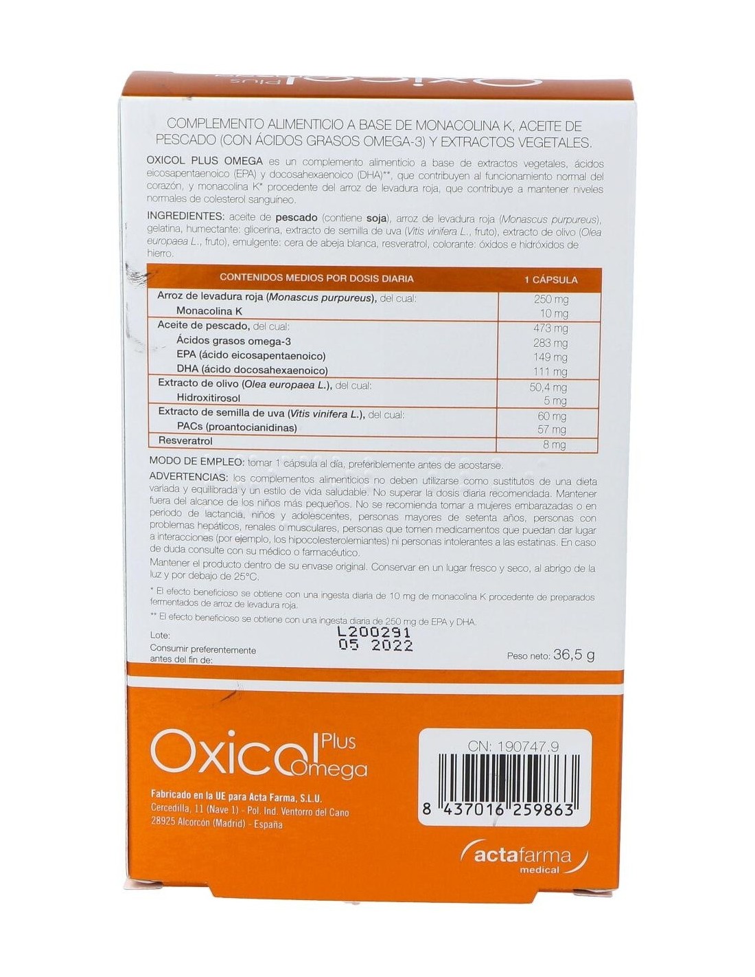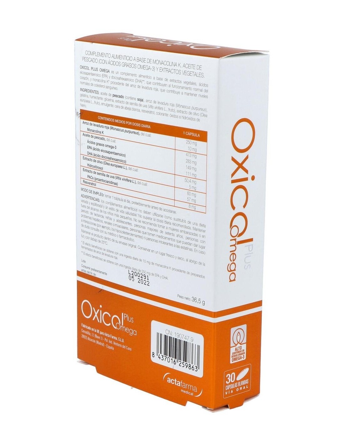 Oxicol Plus Omega 30Cáps son unas cápsulas blandas ricas en ácidos grasos omega-3 (EPA y DHA) y extractos de origen natural. Contribuyen al funcionamiento normal del corazón y a normalizar los niveles de colesterol gracias a la monacolina K (procedente del arroz de levadura roja), el extracto de olivo (hidroxitirosol) y el extracto de uva (polifenoles) y controlan los niveles de colesterol total, LDL (colesterol malo) y LDL oxidado.