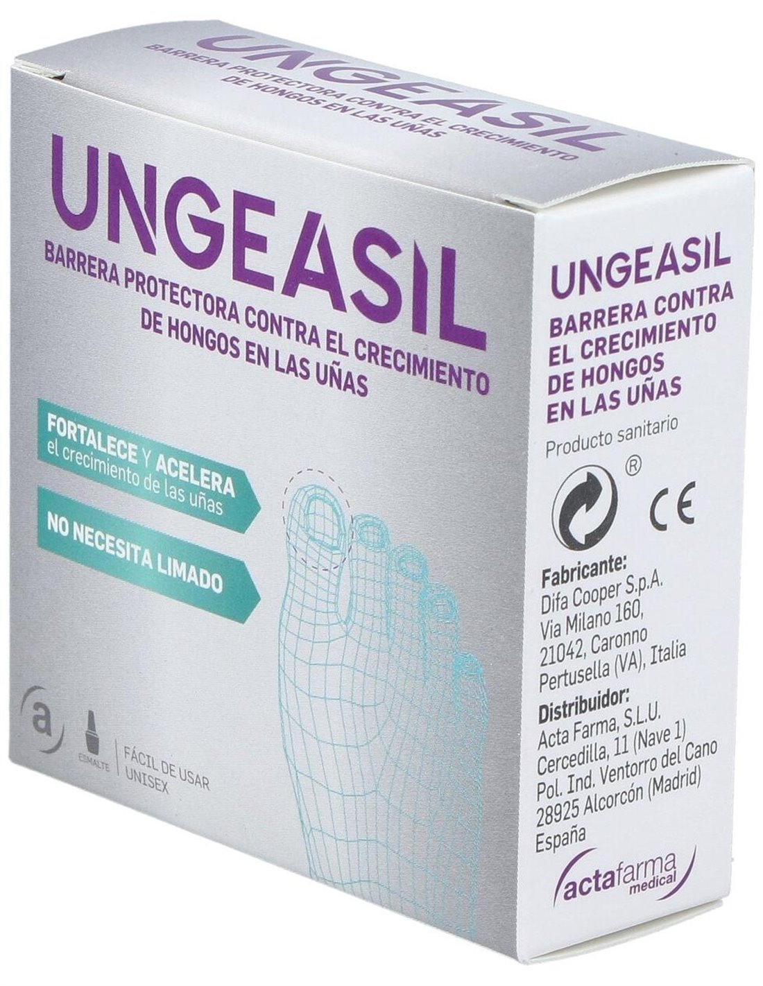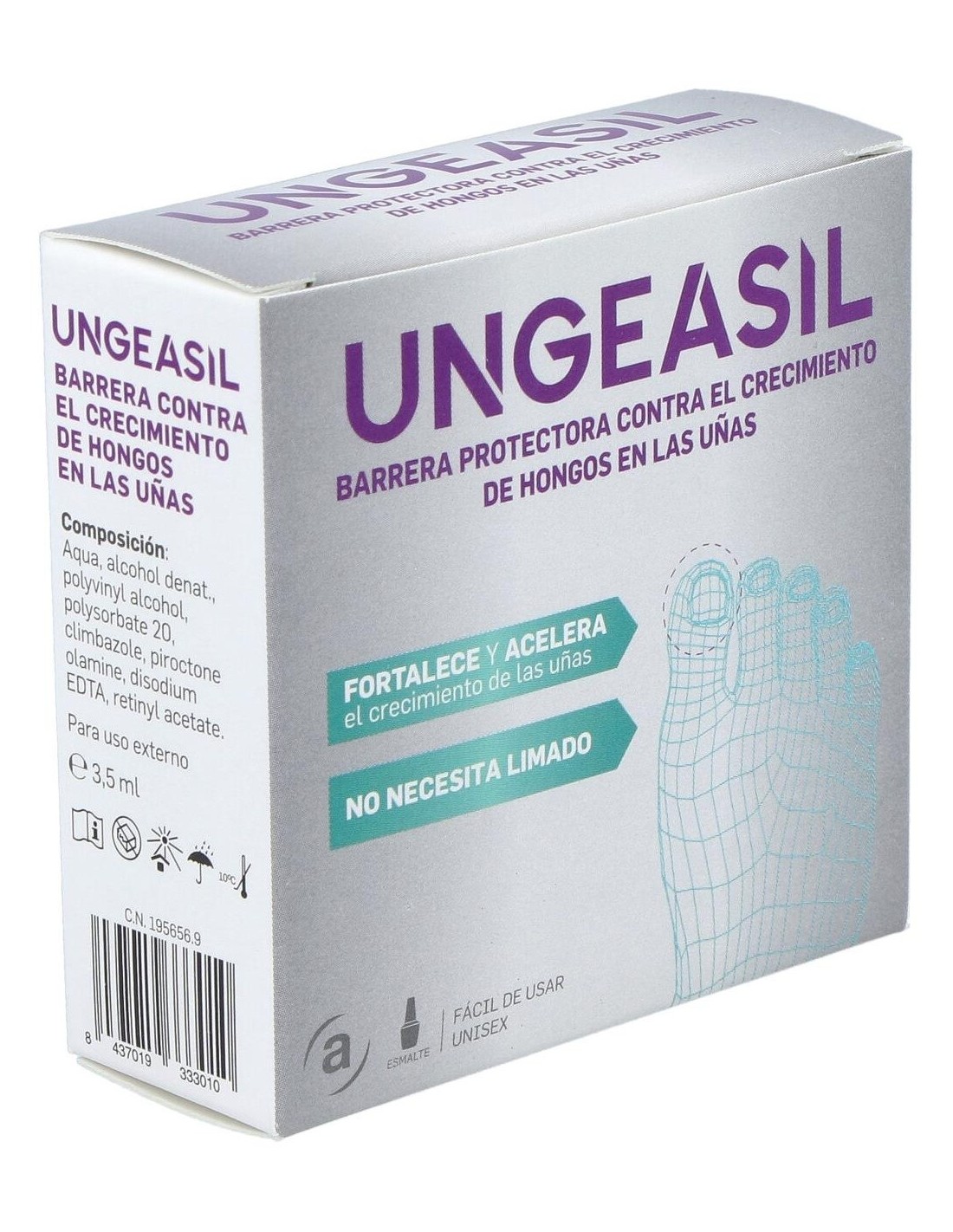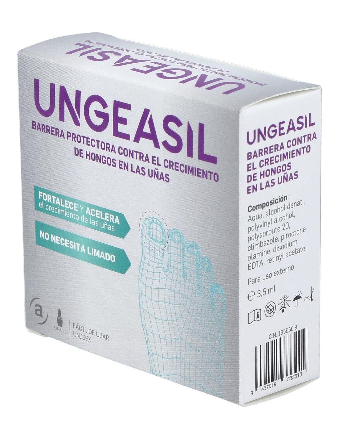 Ungeasil Esmalte 3.5 ml es un producto sanitario que actúa creando una barrera protectora y un ambiente desfavorable para el crecimiento de microorganismos en las uñas, como pueden ser los hongos.
