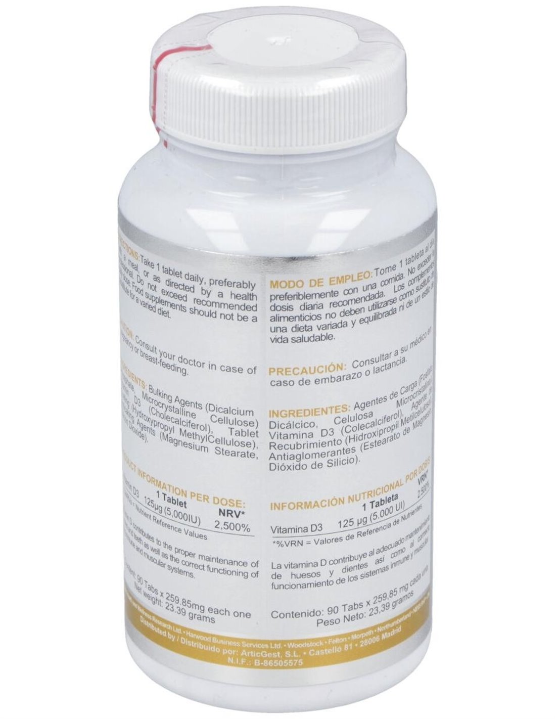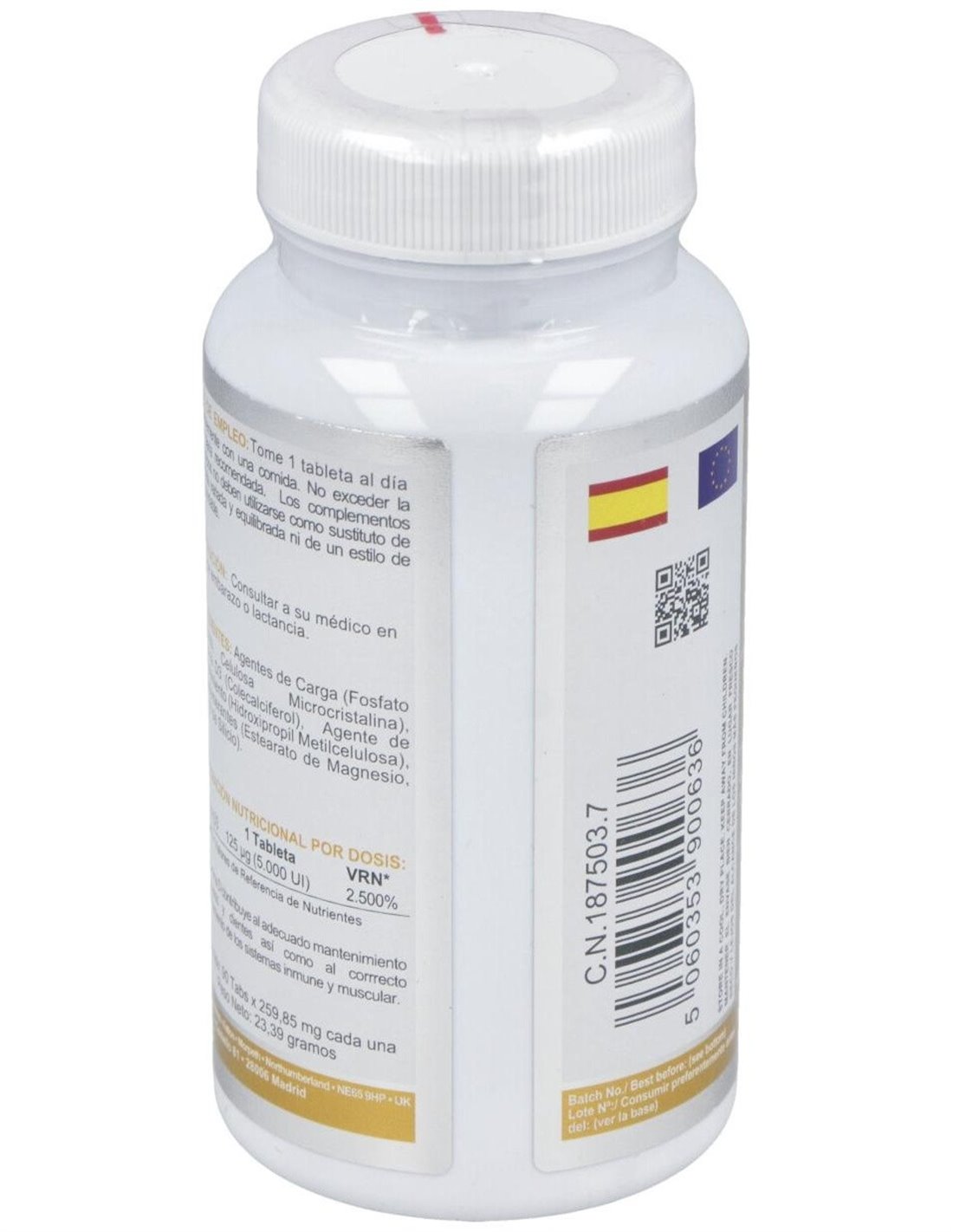 AGENTES DE CARGA ( FOSFATO DICÁLCICO, CELULOSA MICROCRISTALINA), VITAMINA D3, ANTIAGLOMERANTE (ESTEARATO DE MAGNESIO), AGENTE DE RECUBRIMIENTO (HIDROXIPROPIL METILCELULOSA), ANTIAGLOMERANTE (DIÓXIDO DE SILICIO).