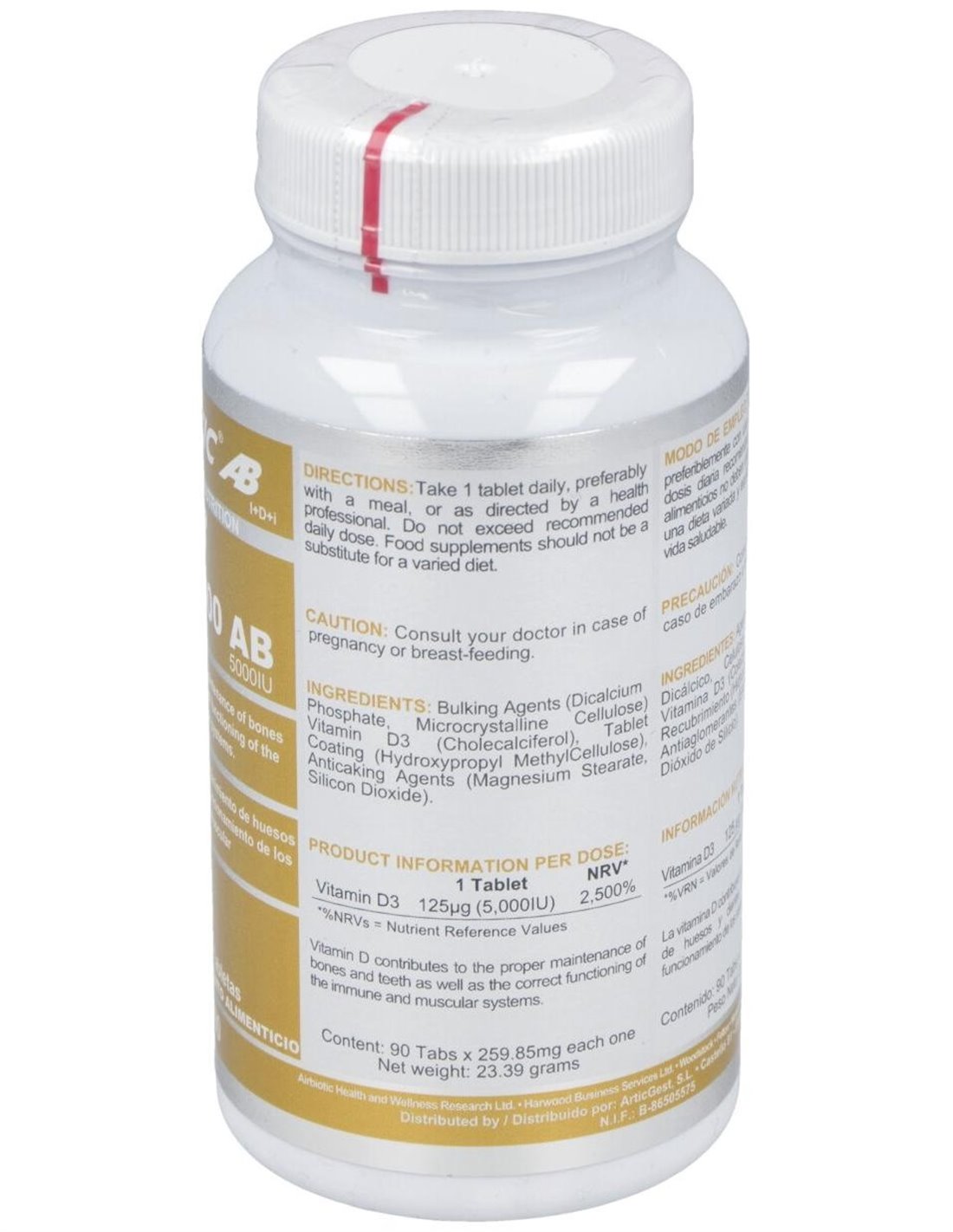 Vitamina D3 de Airbiotic® AB aporta 125 mg de vitamina D3, necesaria en los procesos de absorción y mantenimiento de los niveles de calcio y de fósforo. Además, es apta para el buen funcionamiento del sistema inmunitario y de la función muscular.