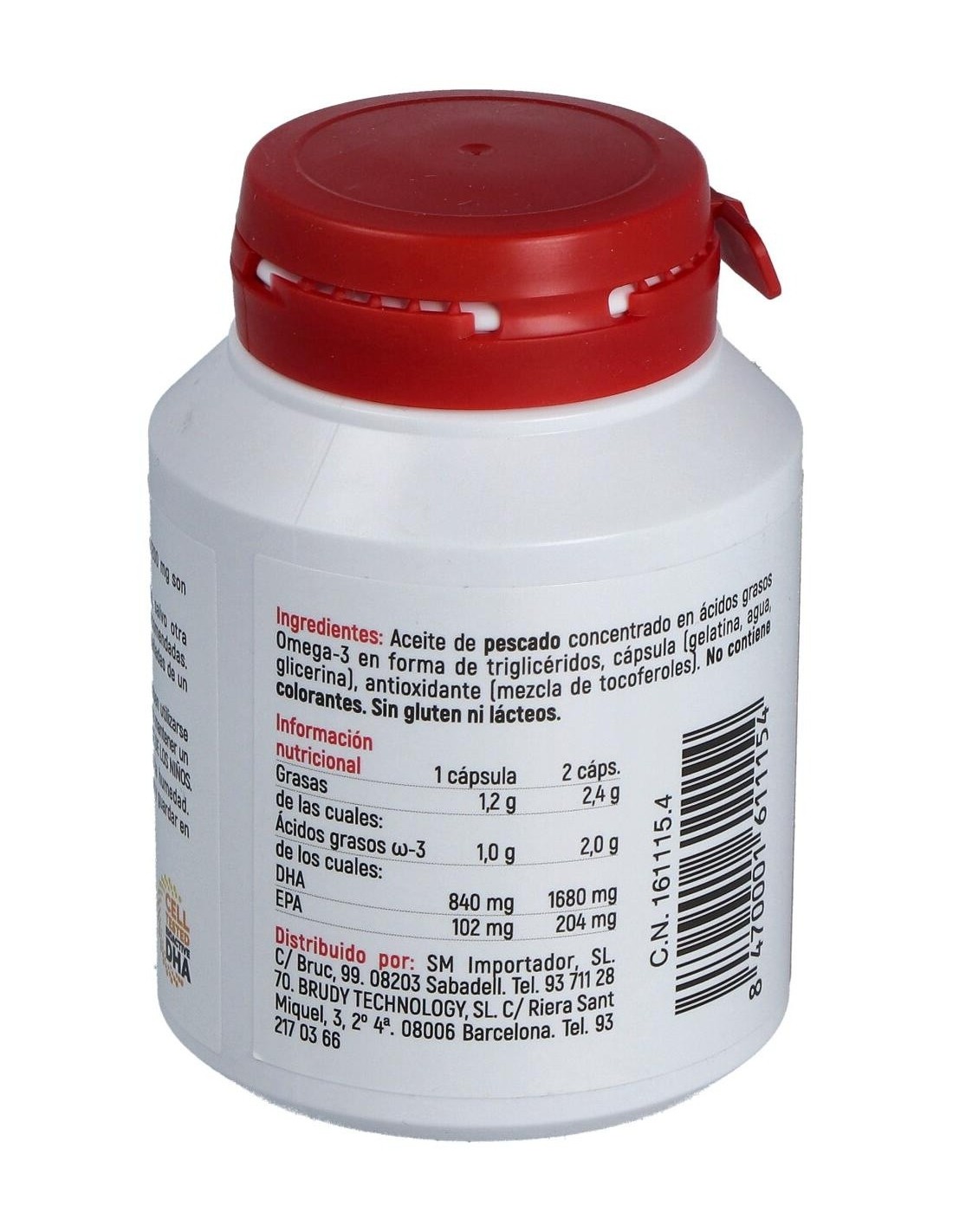 1.200 mg de aceite de pescado concentrado en ácidos grasos Omega-3 en forma de triglicéridos (840 mg DHA y 102 mg EPA), cápsula (gelatina, agua, glicerina), antioxidante (mezcla de tocoferoles).