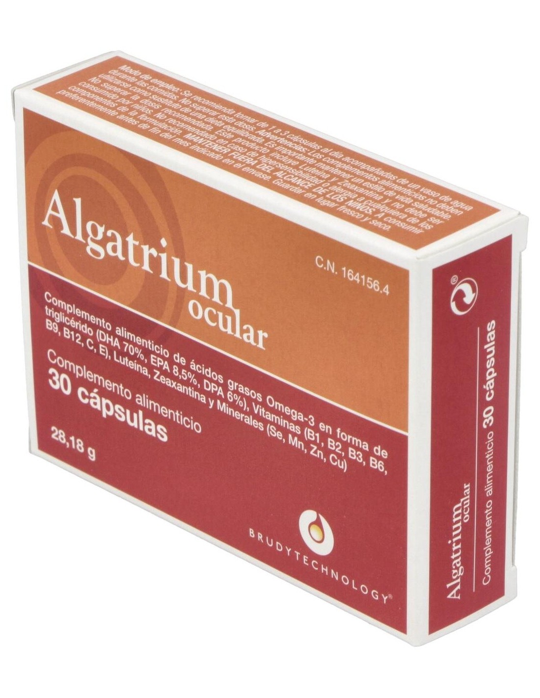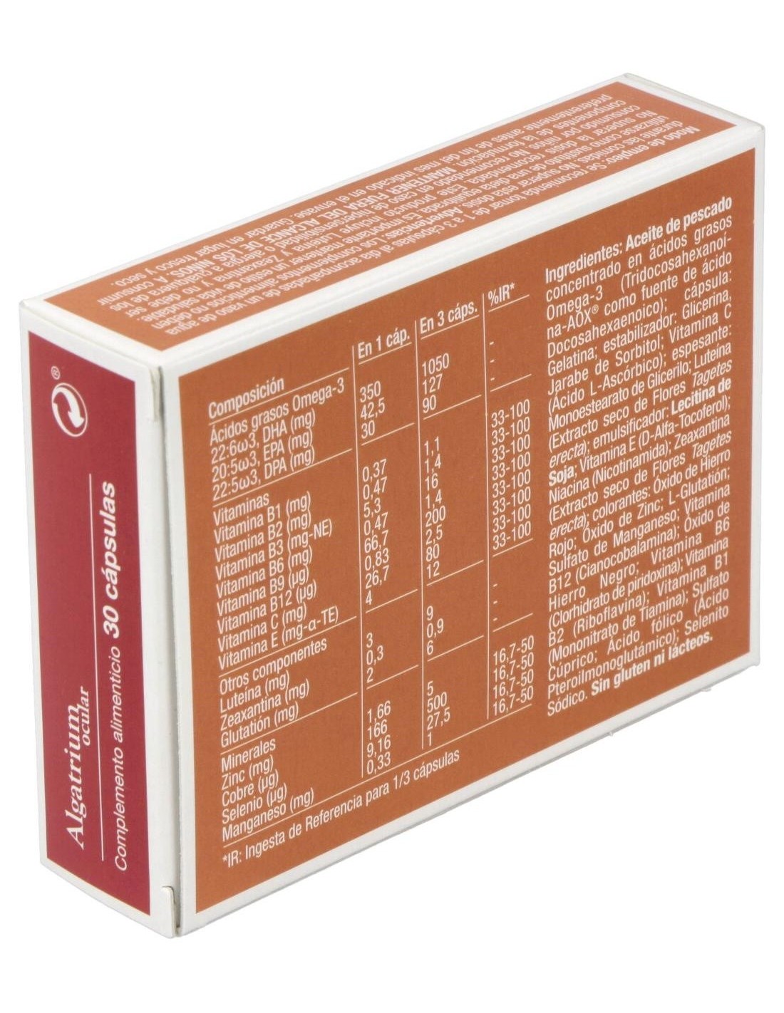 280 mg de DHA Luteína (6 mg), Zeaxantina, Glutation. Minerales: Selenio, Zinc, Cobre, Manganeso. Vitaminas: Vitamina B1,B2,B3,B6,B9,B12, Vitamina C y Vitamina E.