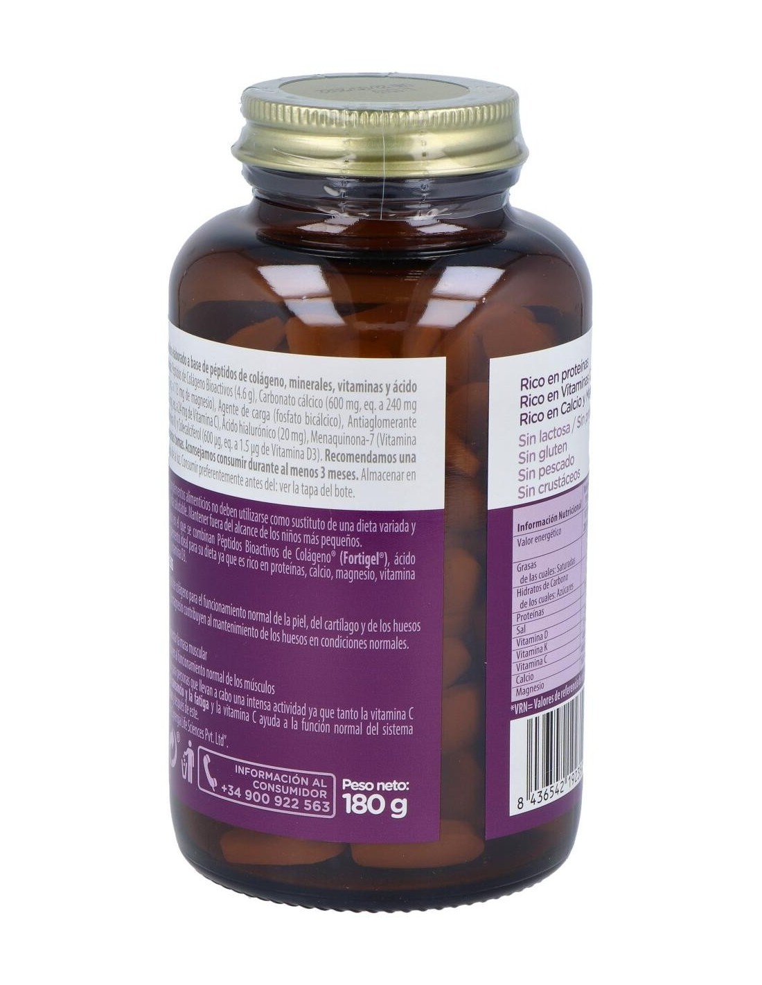 PÉPTIDOS DE COLÁGENO BIOACTIVOS (4,6G), CARBONATO CÁLCICO (600 MG, EQ. A 240 MG DE CALCIO), CARBONATO MAGNÉSICO (446 MG, EQ. A 113 MG DE MAGNESIO), ANTIALOMERANTES (FOSFATO BICÁLCIOCO Y ESTEARATO MAGNÉSICO), ÁCIDO ASCÓRBICO (24.1MG EQ: A 24 MG DE VITAMINA C),ÁCIDO HIALURÓNICO (20 MG), MENAQUINONA-7 (VITAMINAK2-7 NATURAL-MENAQUINOGOLD)(11.3 MG, EQ A 22.5µG DE VITAMINA K) Y COLECALCIFEROL (600µG, EQ A 1.5µG DE VITAMINA D3).