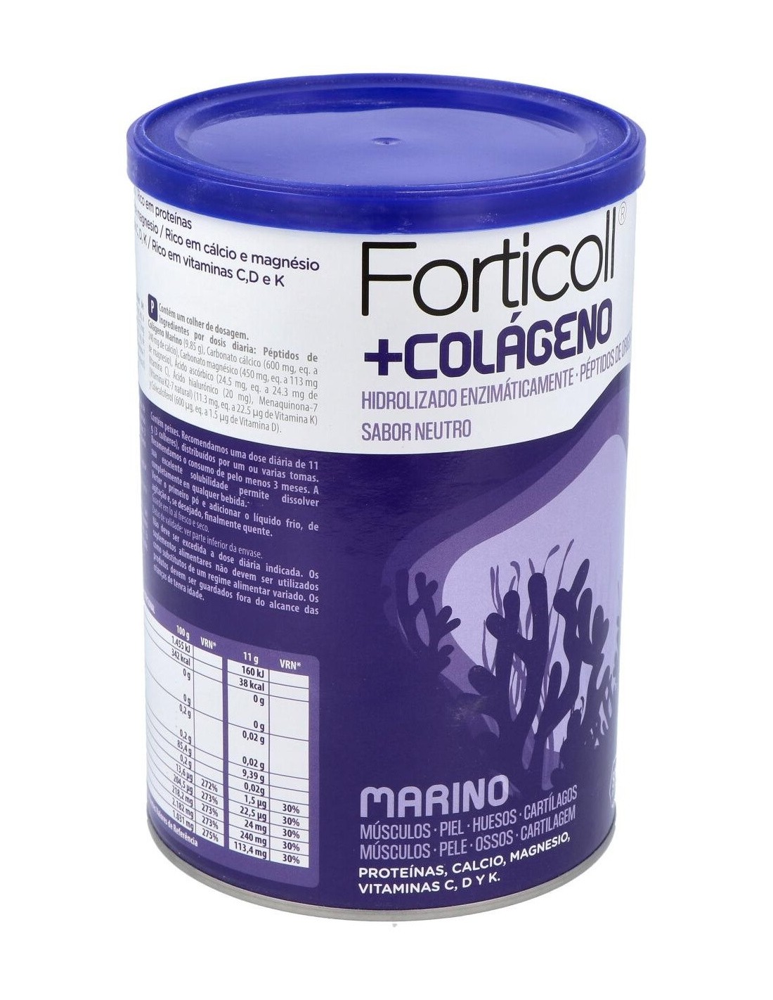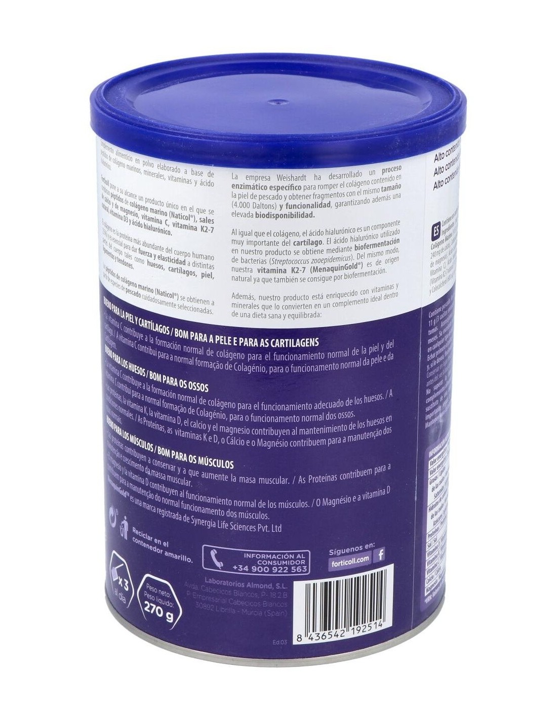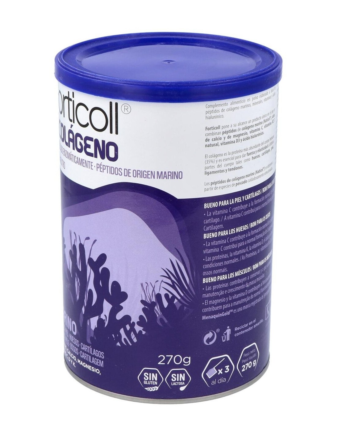 Forticoll Colageno Marino 270g complemento alimenticio en polvo a base de Colágeno Hidrolizado de origen marino, Minerales, Vitaminas y Ácido Hialurónico que proporciona fuerza y elasticidad a huesos, ligamentos, cartílagos, piel y tendones.