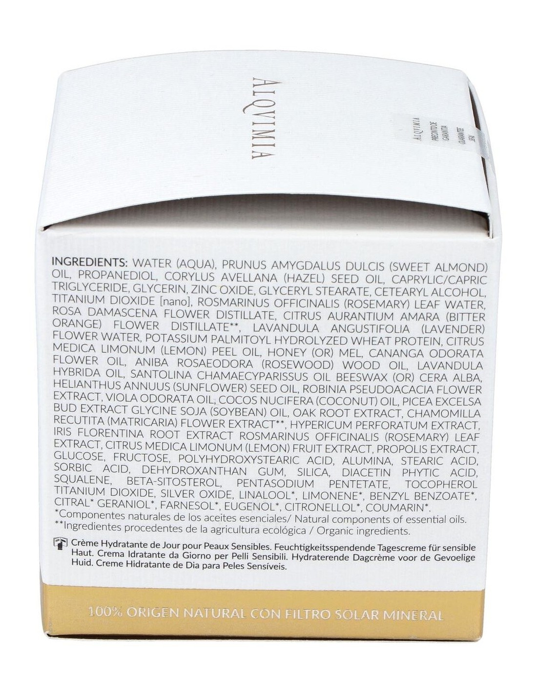 Water (aqua), prunus amygdalus dulcis (sweet almond) oil, propanediol, corylus avellana (hazel) seed oil, caprylic/capric triglyceride, glycerin, zinc oxide, glyceryl stearate, cetearyl alcohol, titanium dioxide [nano]rosmarinus officinalis (rosemary) leaf water, rosa damascena flower distillate, citrus aurantium amara (bitter orange) flower distillate**, lavandula angustifolia (lavender) flower water, potassium palmitoyl hydrolyzed wheat protein, citrus medica limonum (lemon) peel oil, honey (or) mel, cananga odorata flower oil, aniba rosaeodora (rosewood) wood oil, lavandula hybrida oil, santolina chamaecyparissus oil beeswax (or) cera alba, helianthus annuus (sunflower) seed oil, robinia pseudoacacia flower extract, viola odorata oilcocos nucifera (coconut) oil, picea excelsa bud extract glycine soja (soybean) oil, oak root extract, chamomilla recutita (matricaria) flower extract**, hypericum perforatum extractiris florentina root extract rosmarinus officinalis (rosemary) leaf extract, citrus medica limonum (lemon) fruit extract, propolis extract, glucose, fructose, polyhydroxy, stearic acid, alumina, stearic acid, sorbic acid, dehydroxanthan gum, silica, diacetin phytic acid, squalenebeta-sitosterol, pentasodium pentetate, tocopherol titanium dioxide, silver oxide, linalool*, limonene*, benzyl benzoate*, citral*, geraniol*, farnesol*, eugenol*, citronellol*, coumarin*
