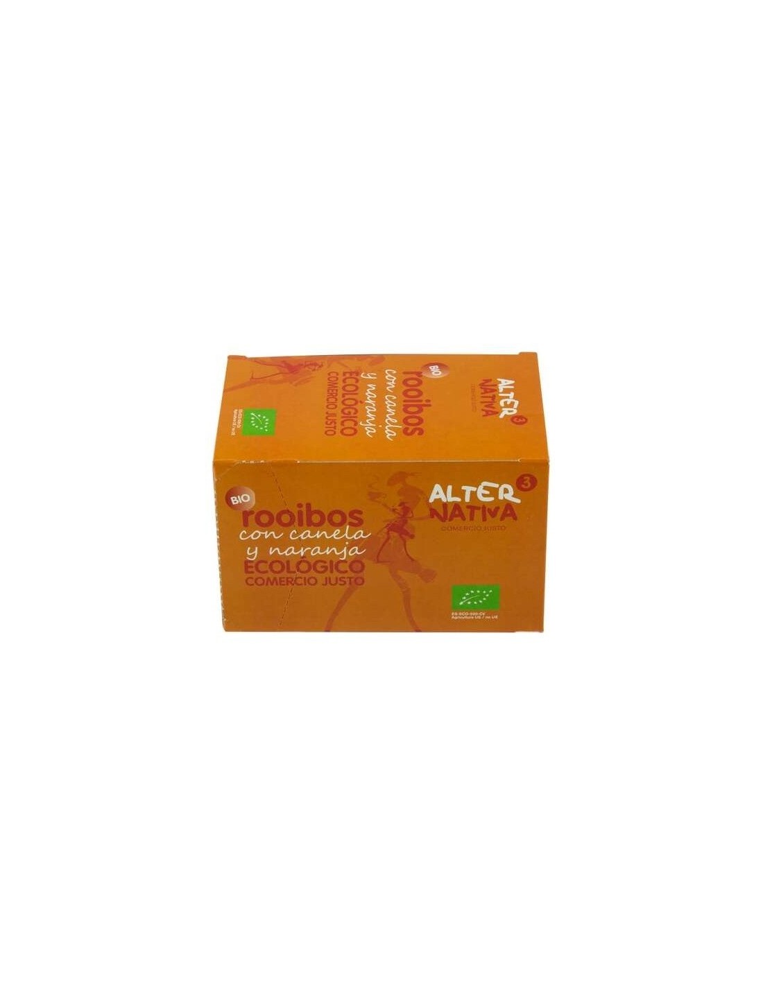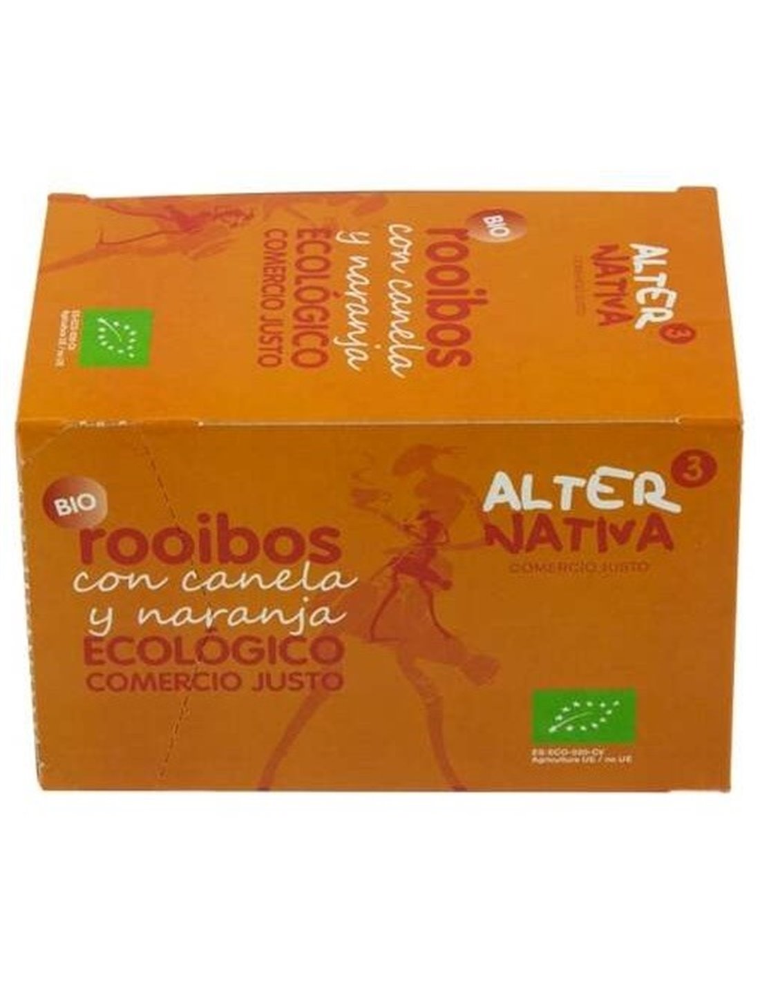 Té de Rooibos con canela y cáscara de naranja en paquete de 20 bolsitas de 1.5gr cada una. Cada bolsa de té contiene rooibos procedentes de Sudáfrica aromatizados con canela y naranja en filtros individuales biodegrabables. Con una bolsita se puede preparar una taza de té para consumir frío o caliente. De sabor dulce, la infusión de rooibos se intensifica con el sabor agridulce de la canela y la naranja. No contiene teína, haciéndolo ideal para personas que no quieren sobreestimular su sistema nervioso. Posee propiedades relajantes, antioxidantes, antiinflamatorias y antialérgicas, entre otras. Esta mezcla de Alternativa3 posee certificado de alimentación ecológica que avala procesos de cultivos sostenibles y prácticas de Comercio Justo. No apto para mujeres propensas a desarrollar cáncer de mama ni personas con tratamiento de quimioterapia. Su consumo en exceso puede causar problemas hepáticos.