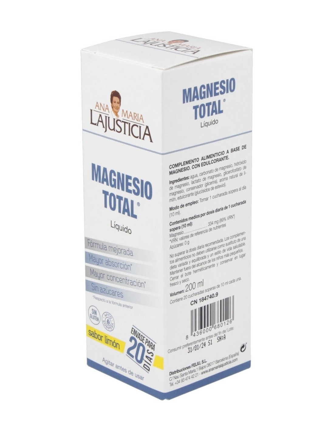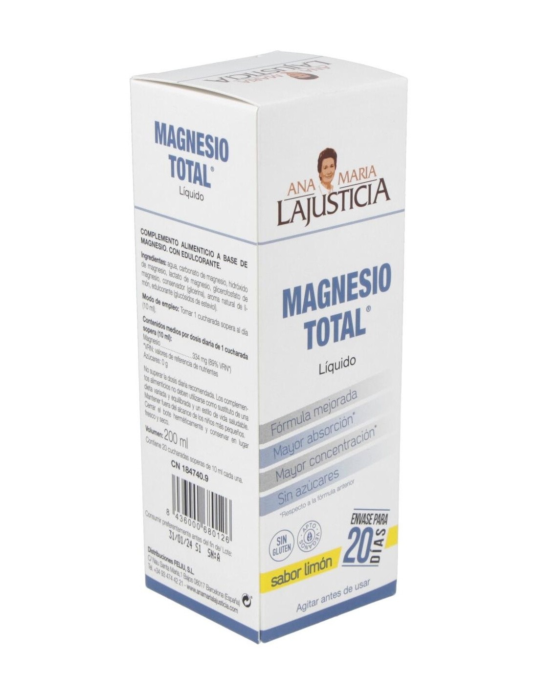 El Magnesio Total Líquido Sabor Limón 200Cc de Ana María Lajusticia es un suplemento mineral para adultos que contribuye al equilibrio de magnesio, facilitando su absorción gracias a su fórmula líquida y sabor agradable.