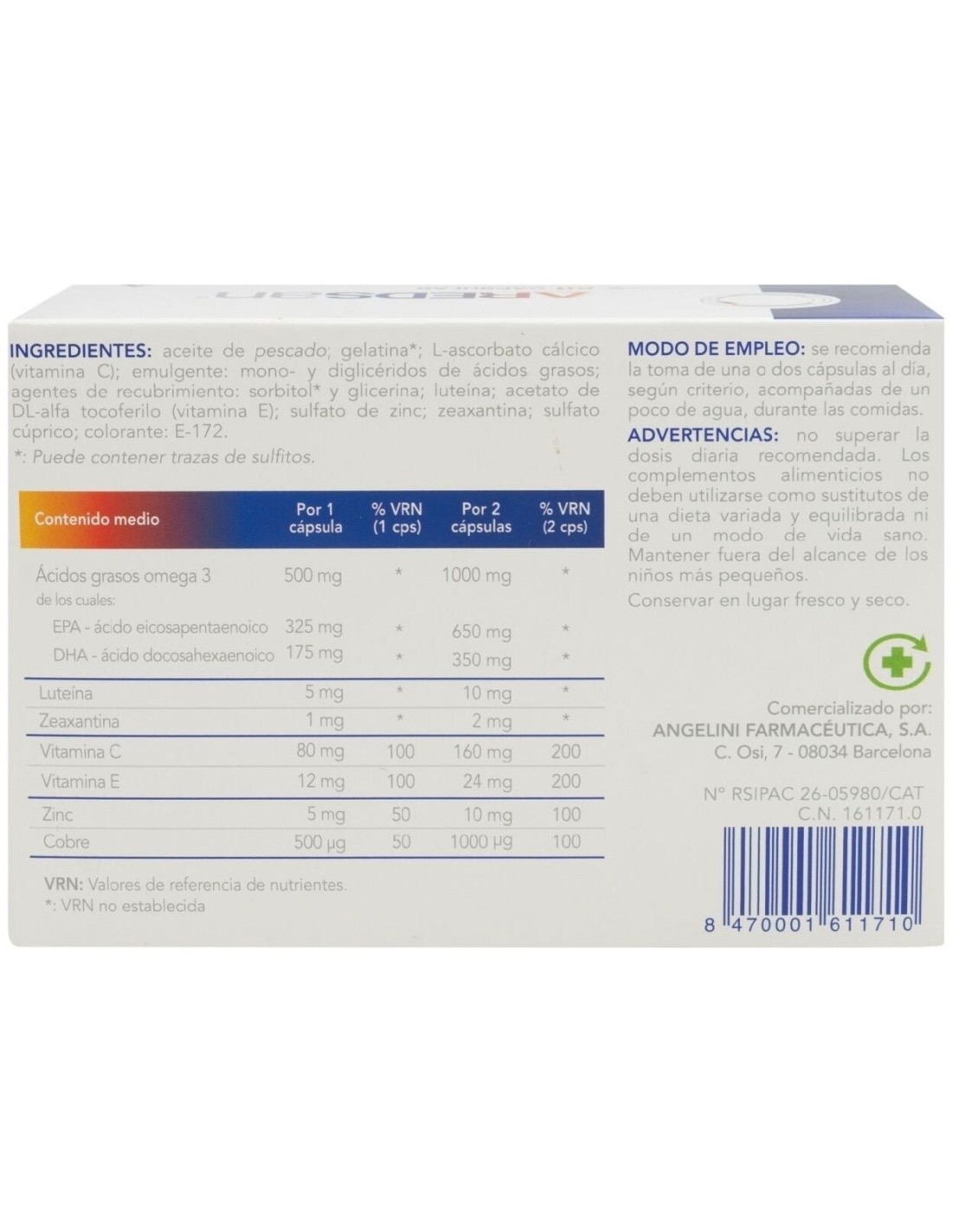 Aceite de pescado; gelatina; L-ascorbato cálcico (vitamina C); emulgente: mono- y diglicéridos de ácidos grasos; agentes de recubrimiento: sorbitol y glicerina; luteína; acetato de DL-alfa tocoferilo (vitamina E); sulfato de zinc; zeaxantina; sulfato cúprico; colorante: E-172. \ \ *Puede contener trazas de sulfitos.