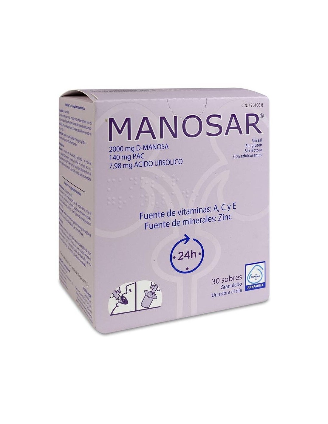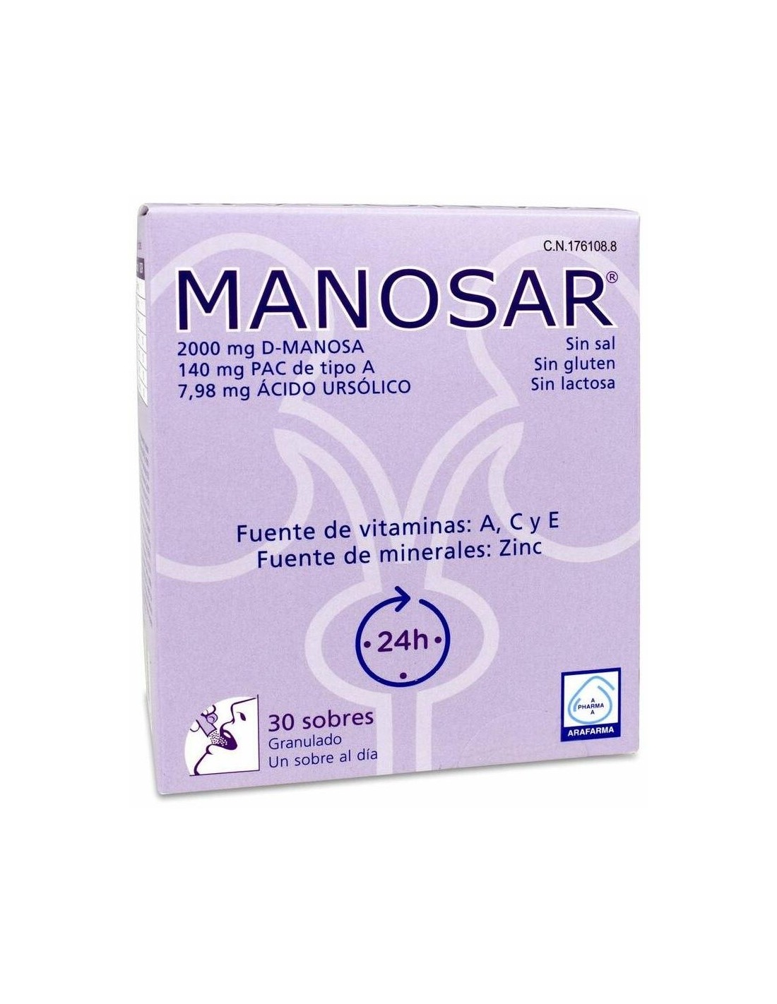 ARAFARMAIncluye en su formulación D-Manosa y PAC en cantidades eficaces que se complementan en su mecanismo de acción de ayuda al normal mantenimiento de las vías urinarias. \ \ Manosar sobres, es un complemento alimenticio natural que ayuda a mantener las vías urinarias en condiciones normales, gracias a que contiene: D-Manosa retard, un tipo de azúcar que previene la adhesión de bacterias en las vías urinarias, Pac tipo A de frutos rojos, vitamina C que aporta vitalidad, vitamina E que ayuda al normal mantenimiento del sistema inmunológico, y zinc que regula y equilibra el sistema inmunológico. Todos estos componentes trabajan juntos para apoyar el sistema inmunológico de utilidad frente a infecciones urinarias y cistitis. \ Manosar es un producto que interfiere en la adherencia de E.Coli, la sustancia responsable de las infecciones urinarias. Además, también previene la cistitis poscoital. Manosar 30 sobres en granulados se pueden tomar directamente con agua.