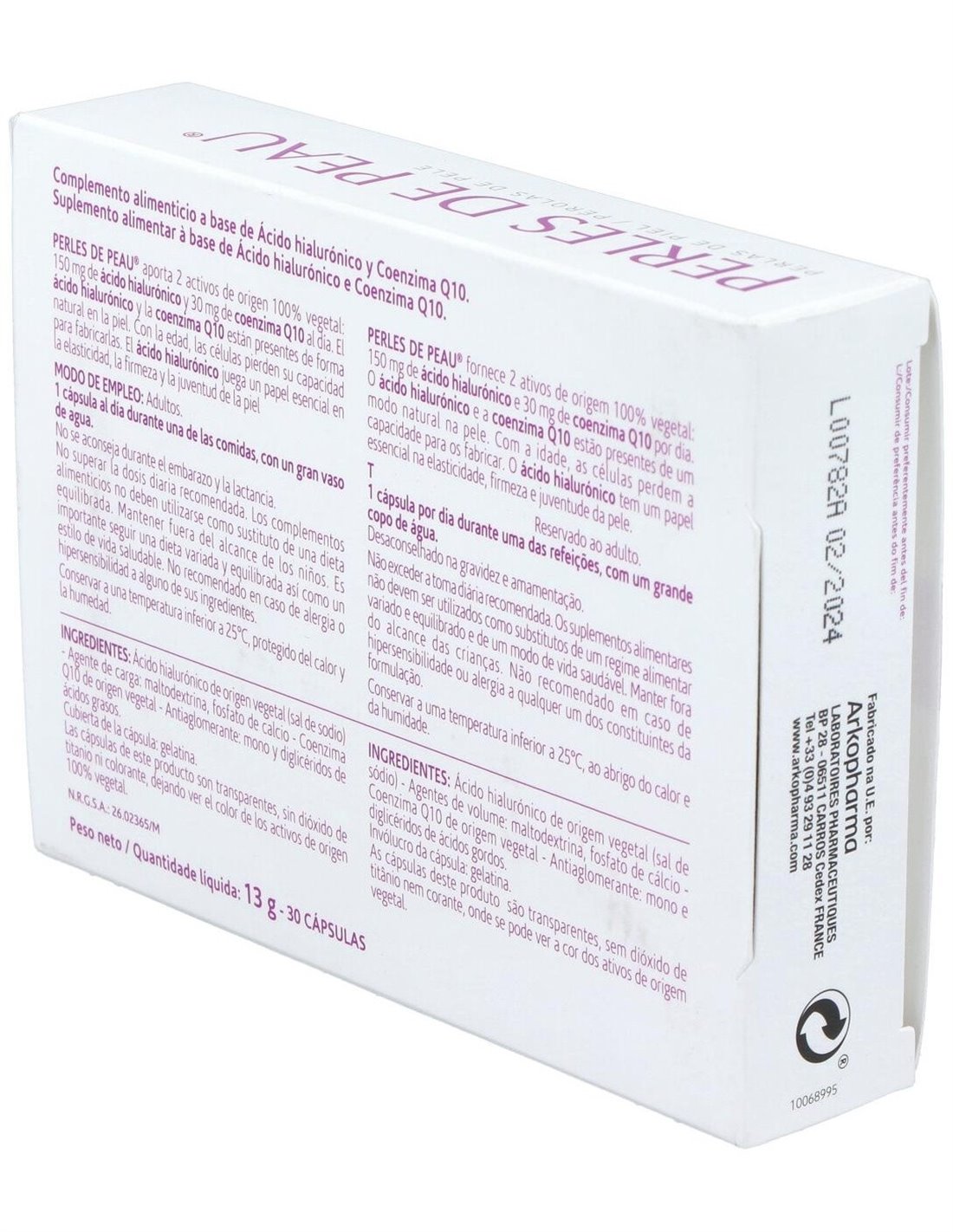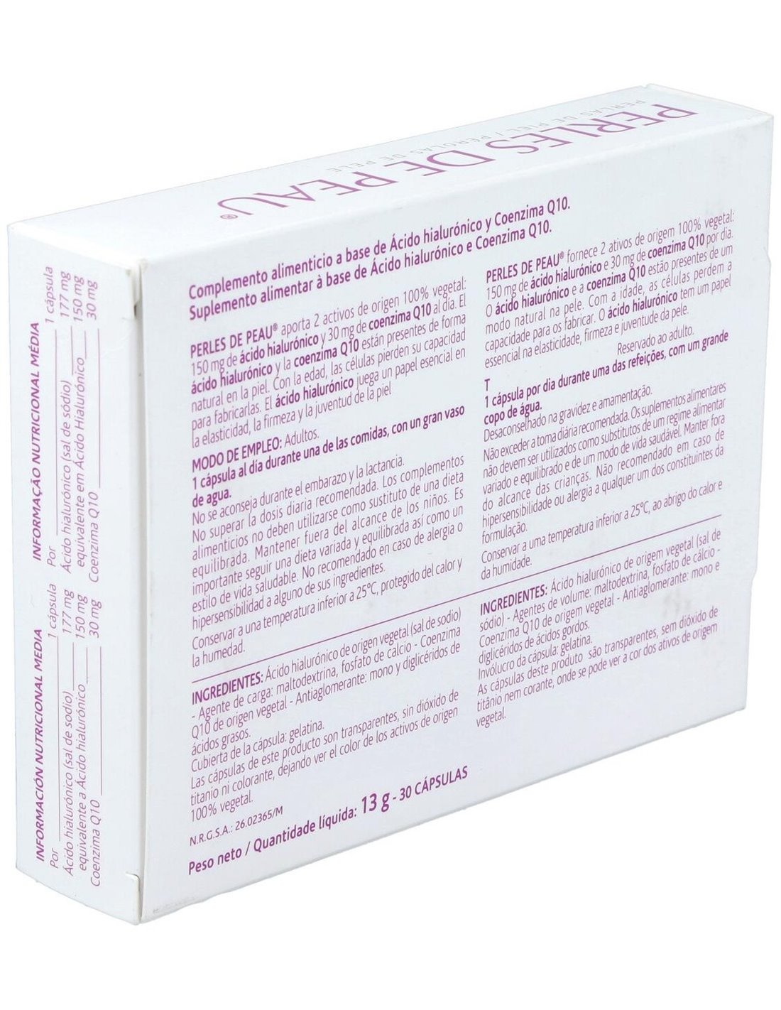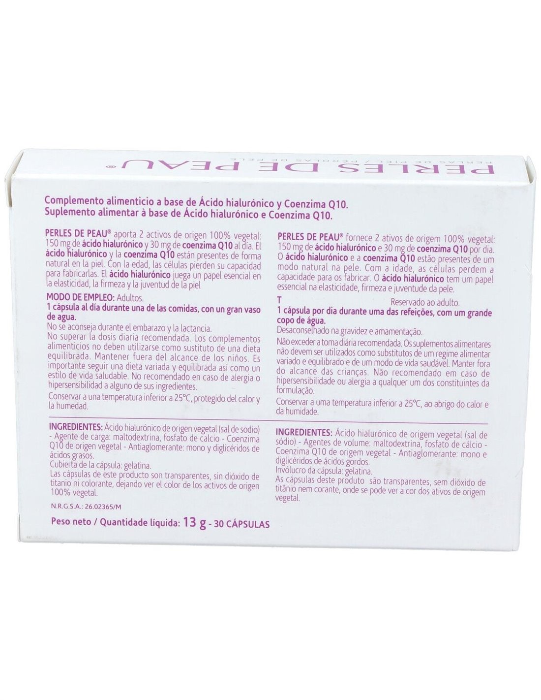 Ácido hialurónico de origen vegetal (sal de sodio) - Agente de carga: maltodextrina, fosfato de calcio - Coenzima Q10 de origen vegetal - Antiaglomerante: mono y diglicéridos de ácidos grasos. Cubierta de la cápsula: gelatina.