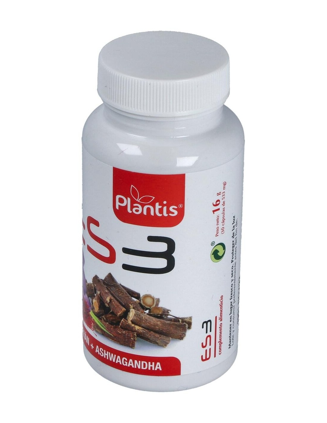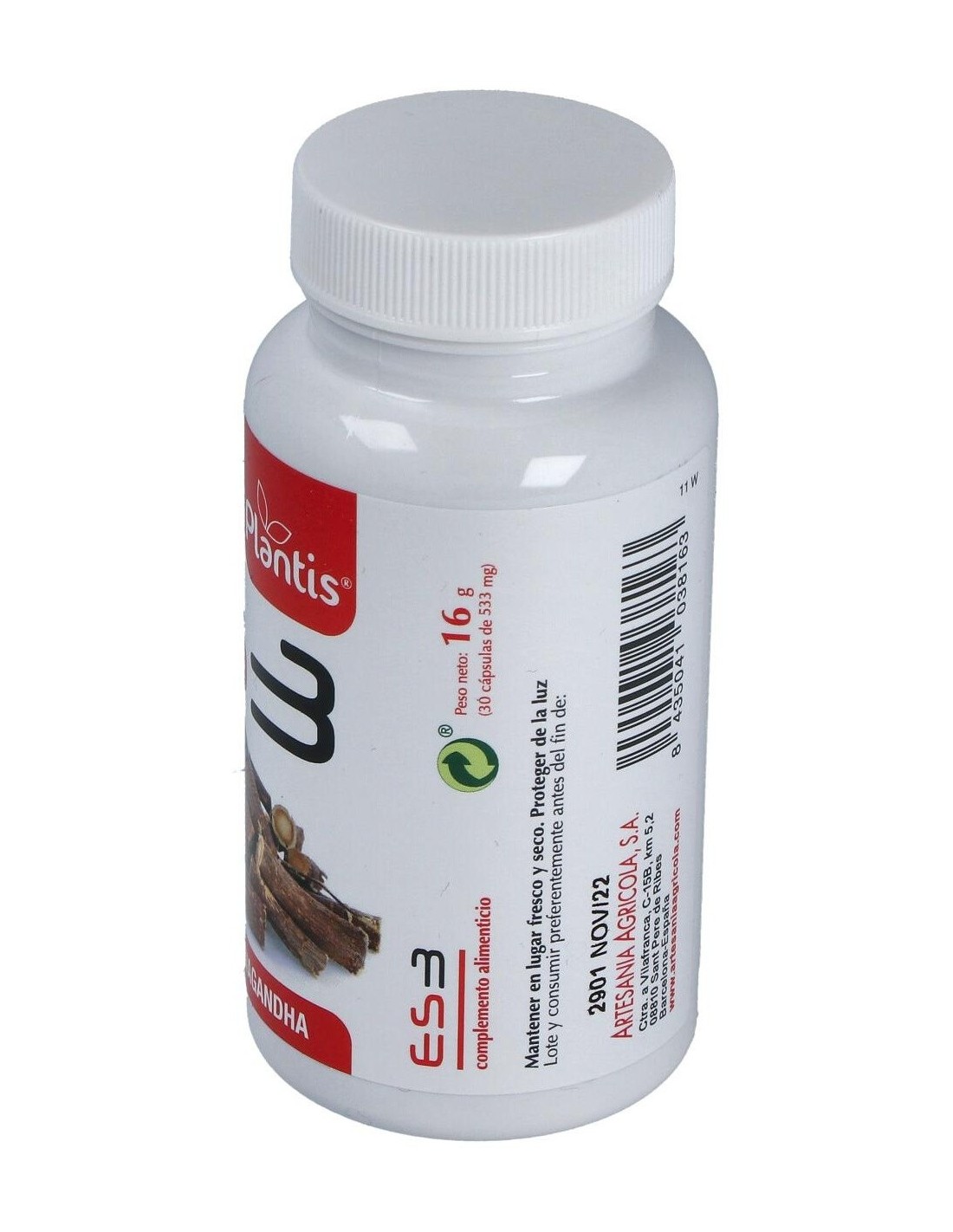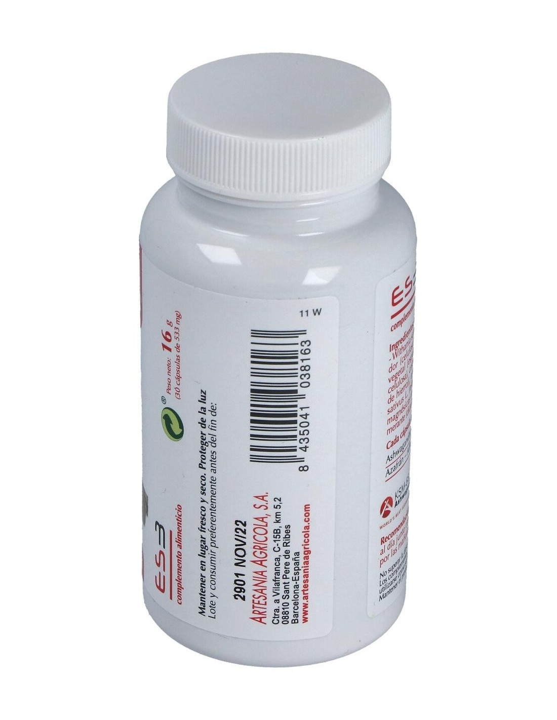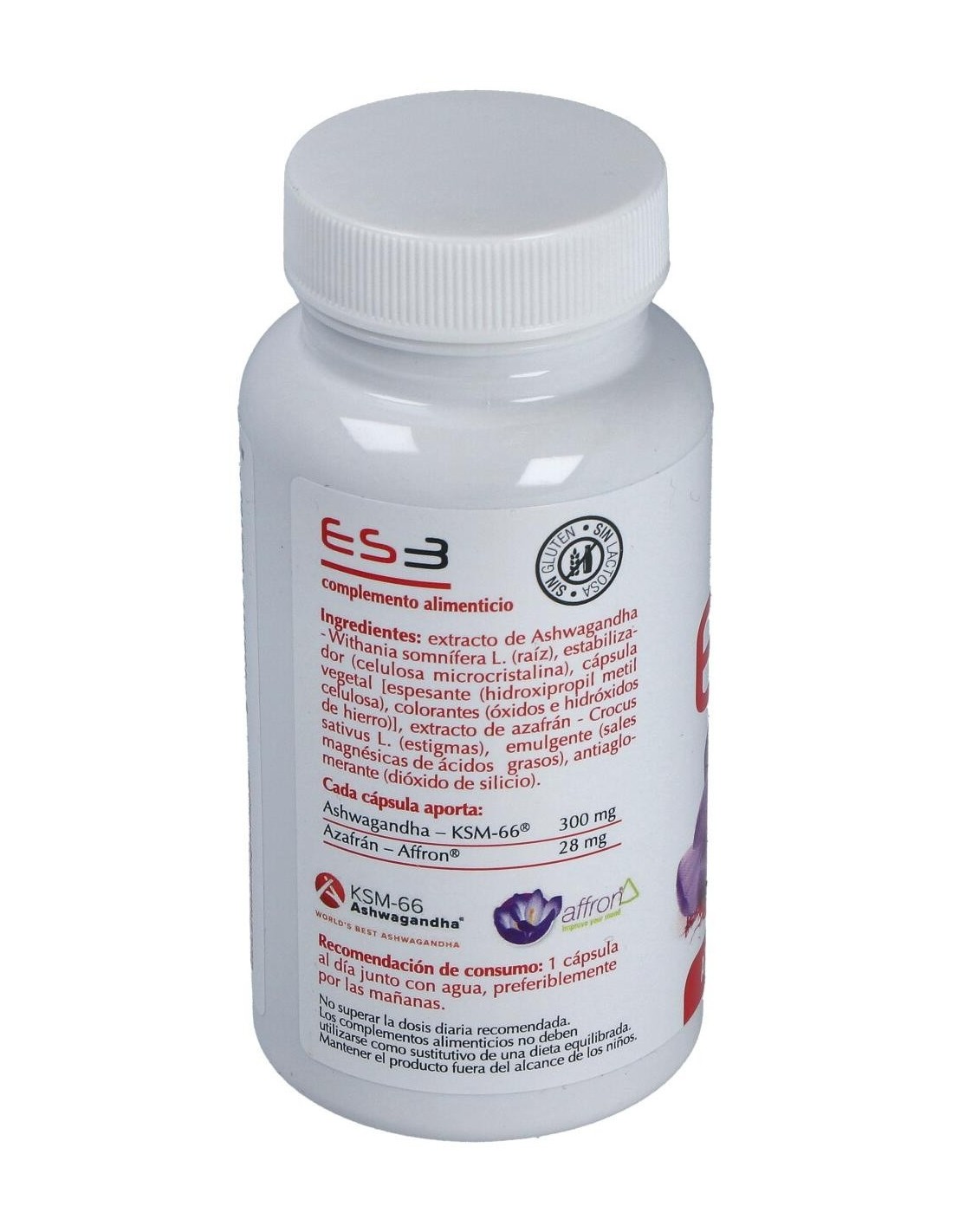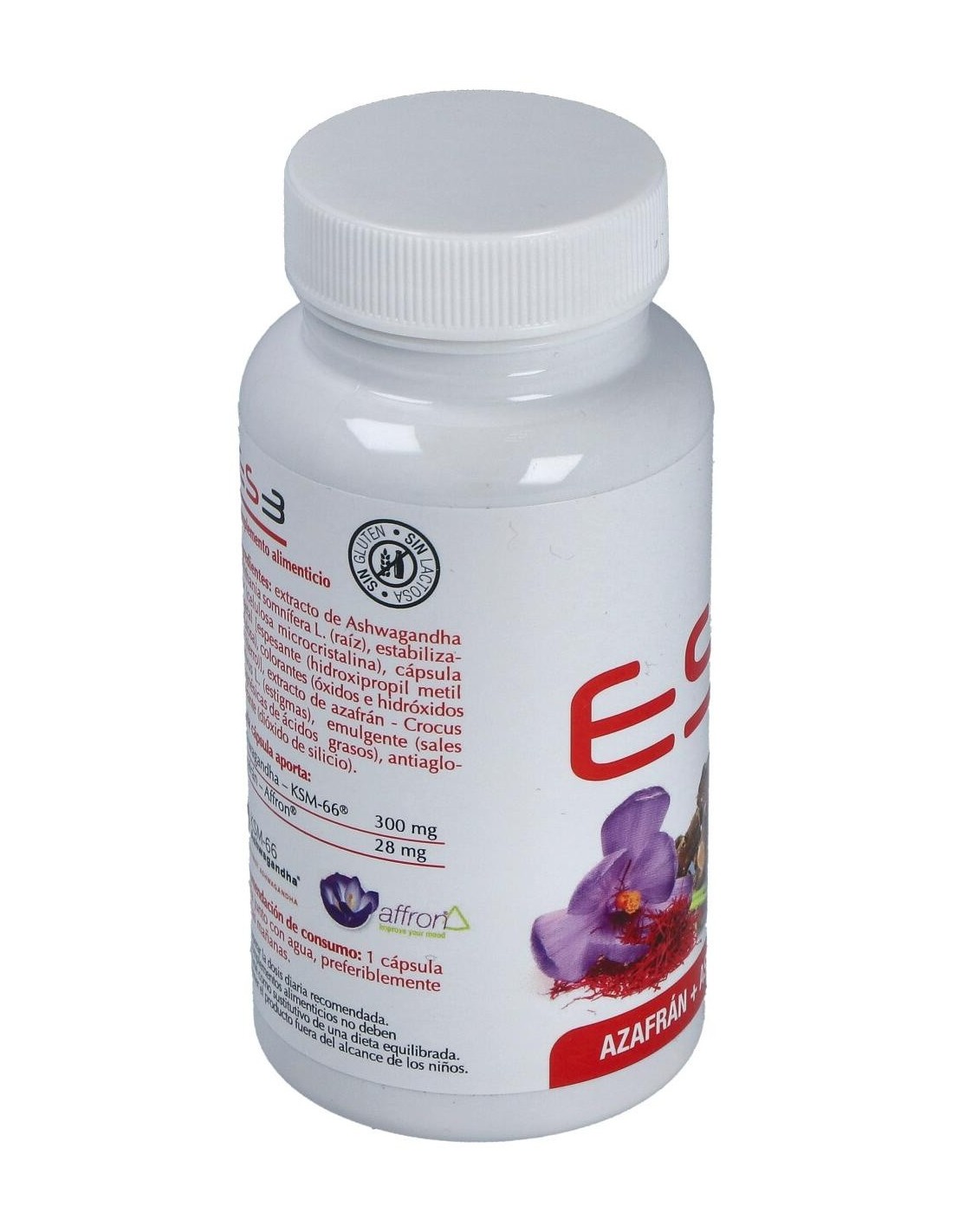 Extracto de Ashwagandha, Withania somnífera L. (raíz), estabilizador (celulosa microcristalina), cápsula vegetal [espesante (hidroxipropil metil celulosa), colorantes (óxidos e hidróxidos de hierro)], extracto de azafrán, Crocus sativus L. (estigmas), emulgente (sales magnésicas de ácidos grasos), antiaglomerante (dióxido de silicio).