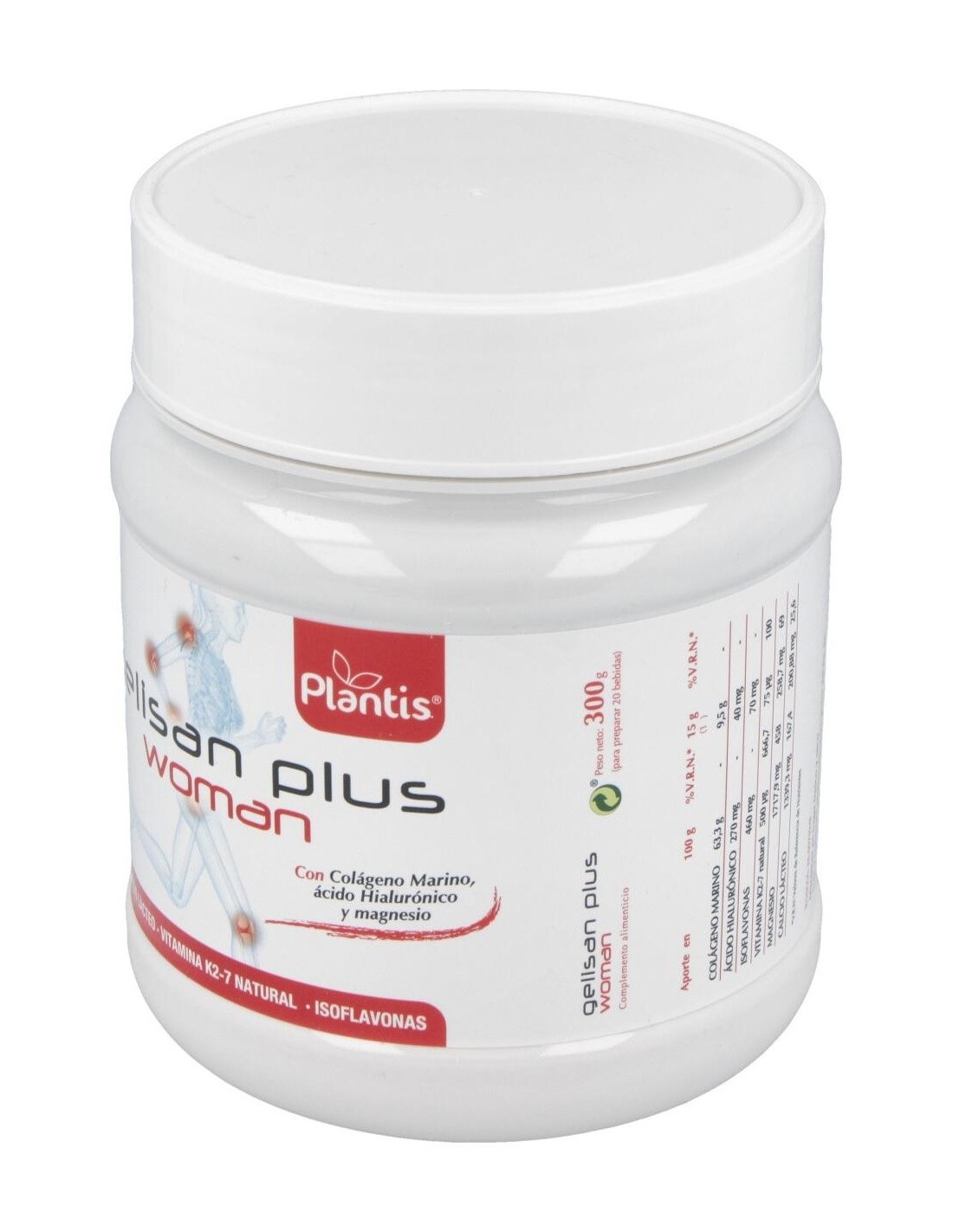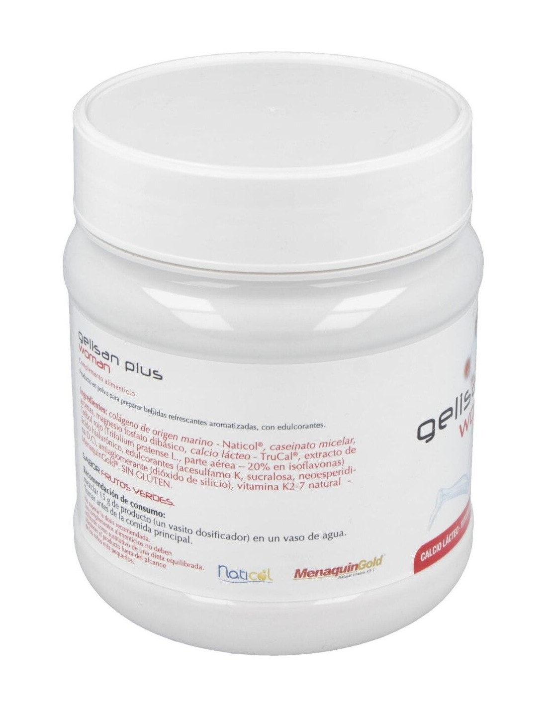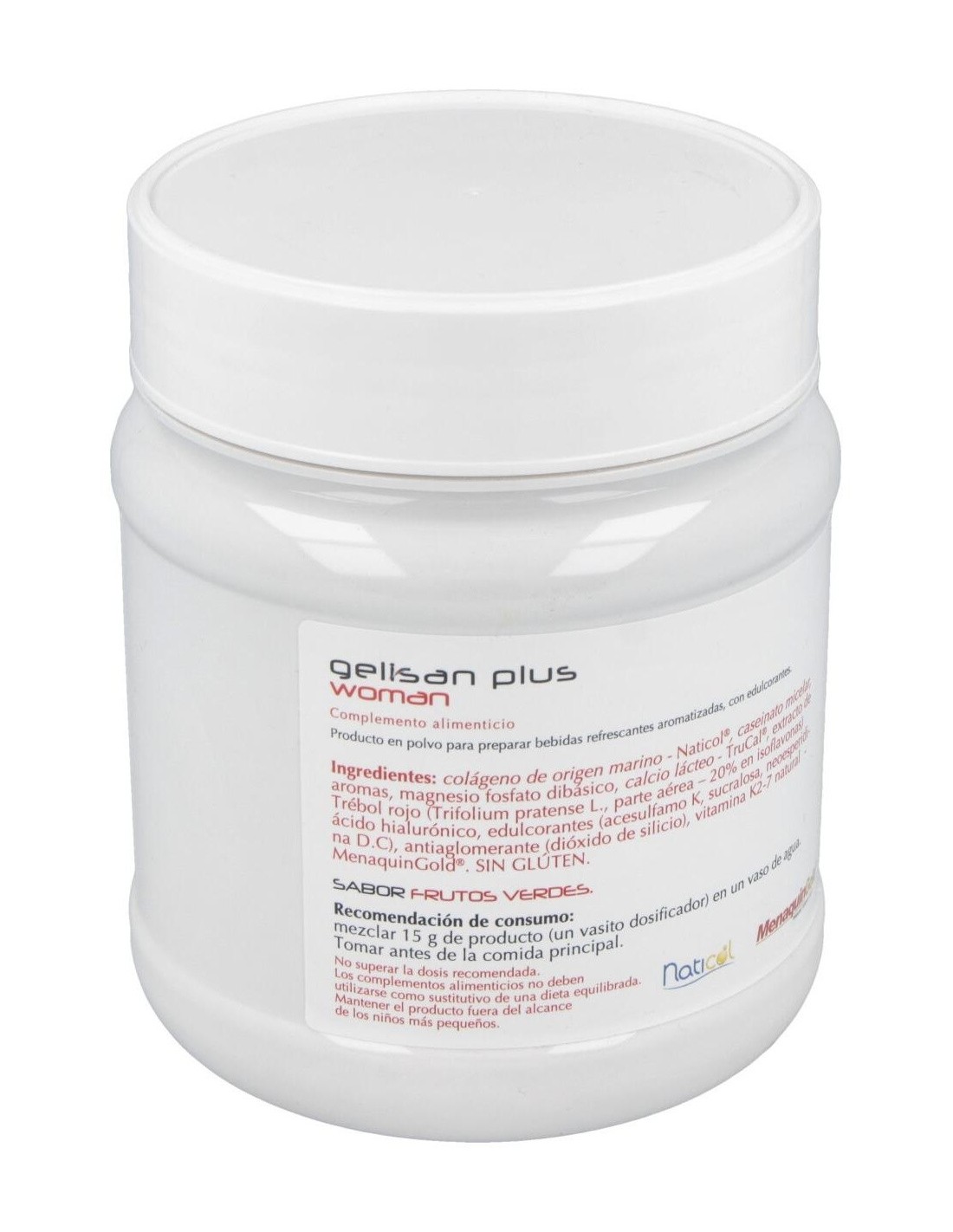 20% en isoflavonas) ácido hialurónico, edulcorantes (acesulfamo K, sucralosa, neoesperidina D.C), antiaglomerante (dióxido de silicio), vitamina K2-7 natural (MenaquinGold®).