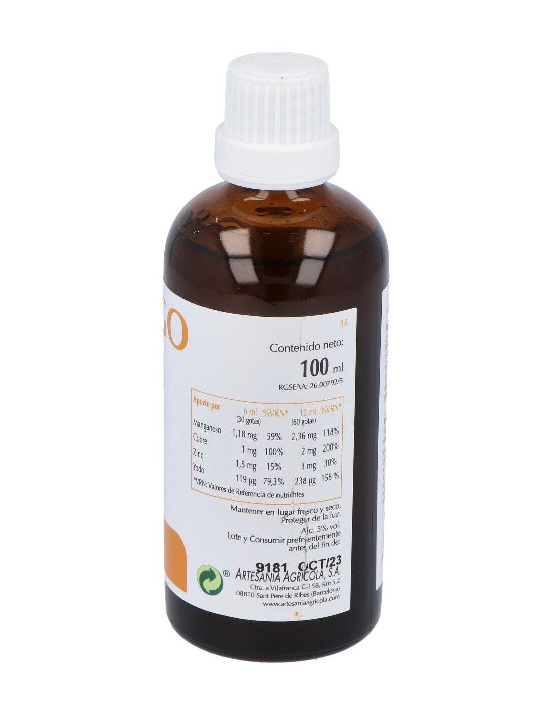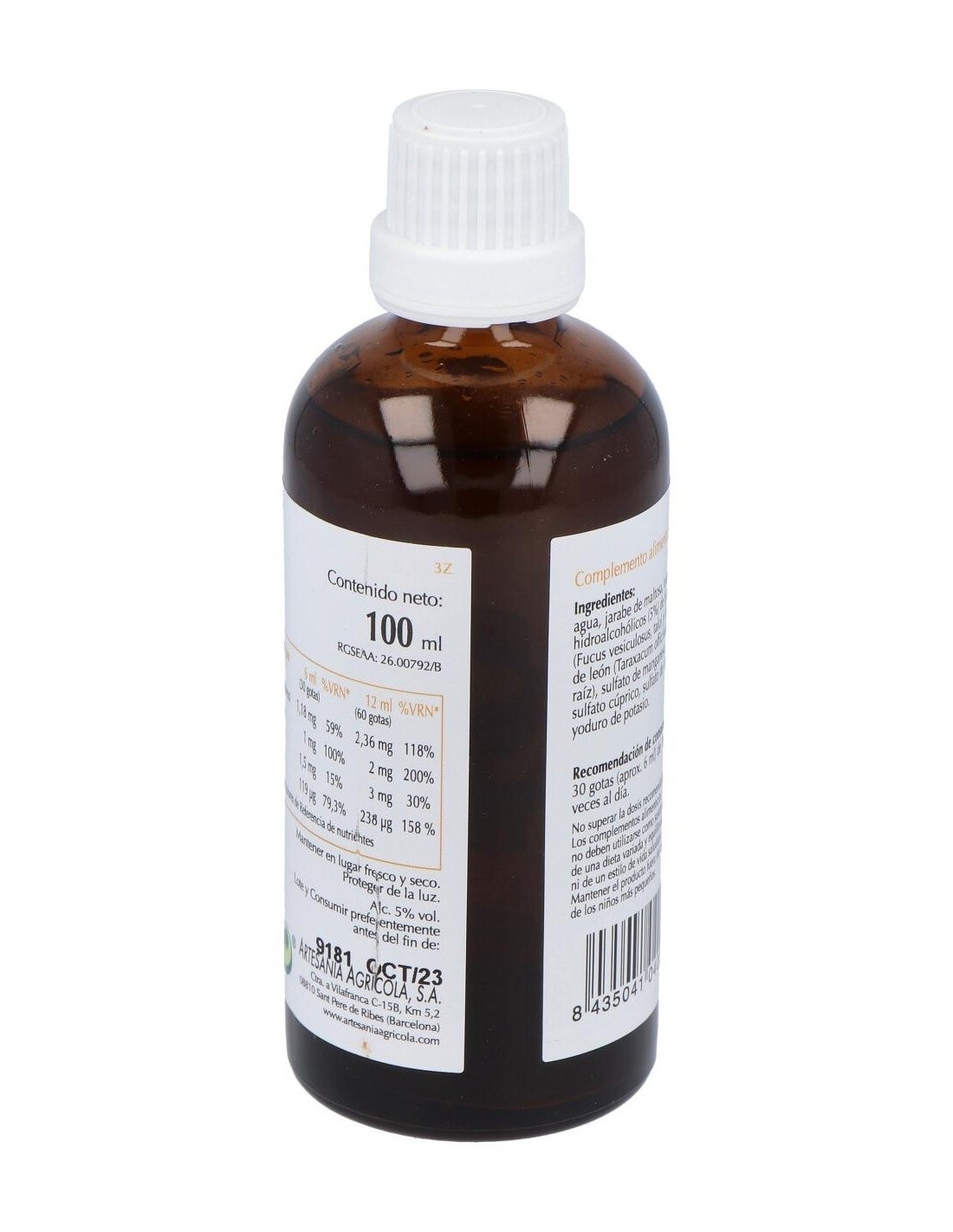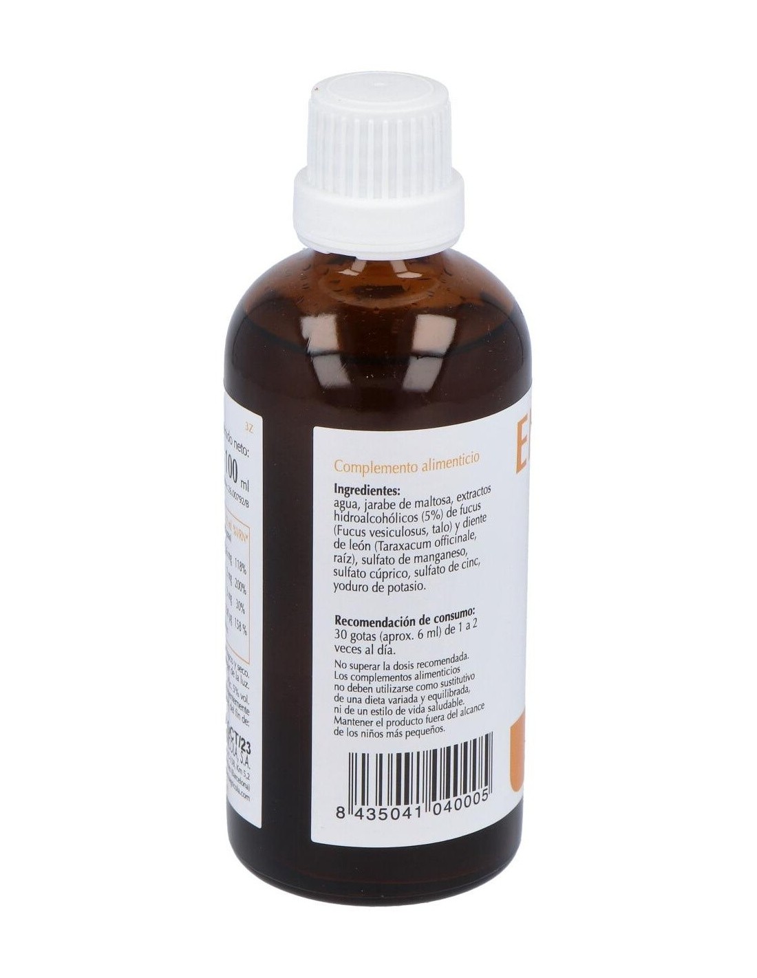Agua (58%), jarabe de maltosa (37%), extractos hidroalcohólicos de fucus y diente de león, sulfato de manganeso, sulfato cúprico, sulfato de cinc, yoduro de potasio.