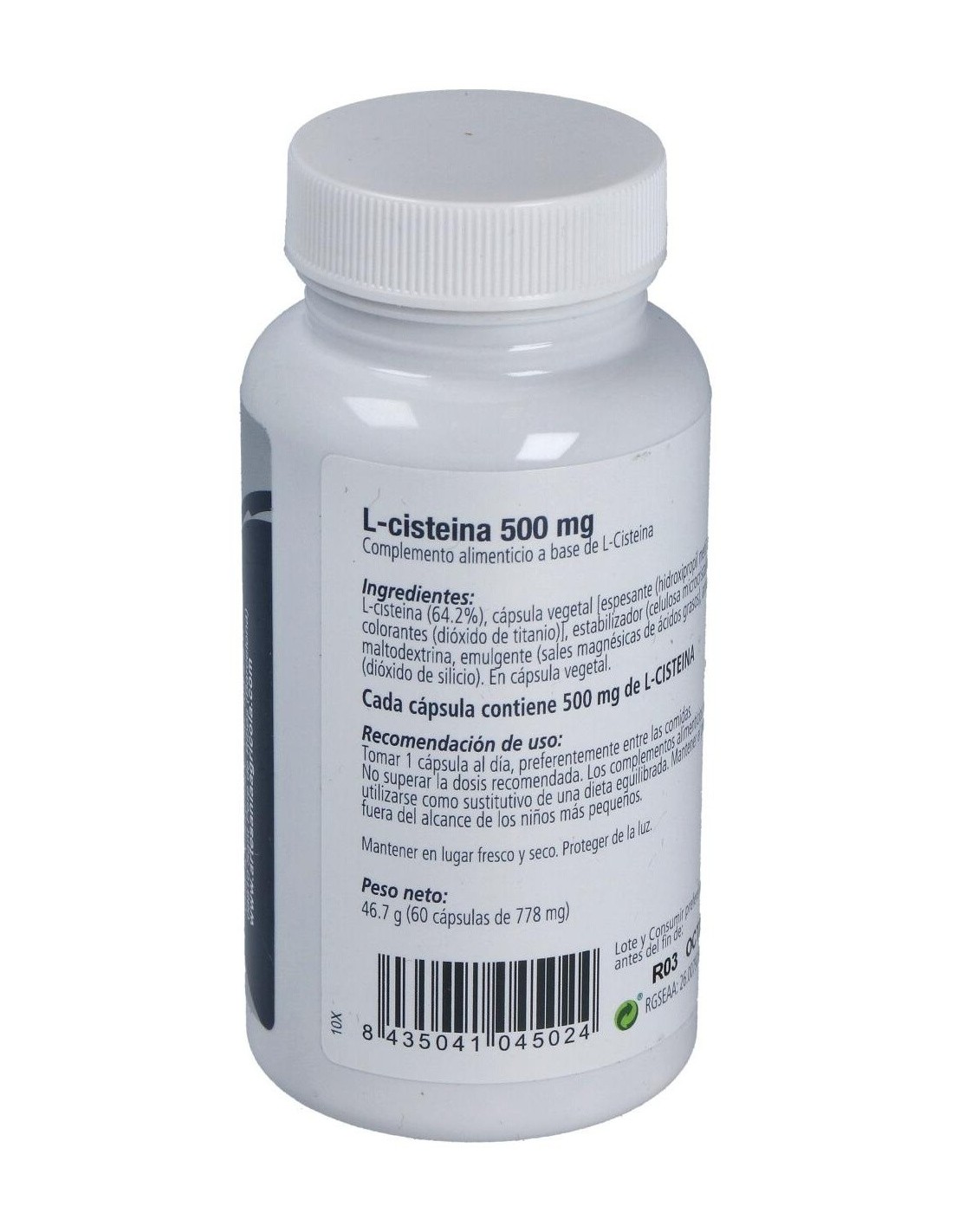 L-cisteina (64.2%), Cápsula Vegetal [Espesante (Hidroxipropil Metil Celulosa), Colorantes (Dióxido De Titanio)], Estabilizador (Celulosa Microcristalina), Maltodextrina, Emulgente (Sales Magnésicas De Ácidos Grasos), Antiaglomerante (Dióxido De Silicio). En Cápsula Vegetal