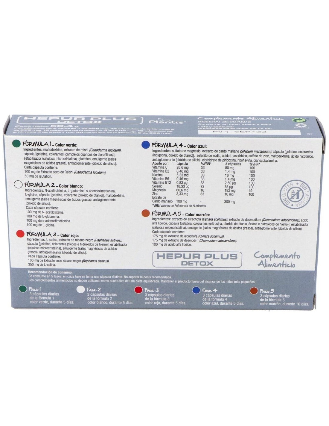 Fórmula 5 (color marrón): Extracto de alcachofa, extracto de desmodium, ácido alfa lipoico, cápsula (gelatina, colorantes (eritrosina, dióxido de titanio, óxidos e hidrócidos de hierro)), estabilizador (celulosa microscristalina), emulgente (sales magnésicas de ácidos grasos), antiaglomerante (dióxido de silicio).