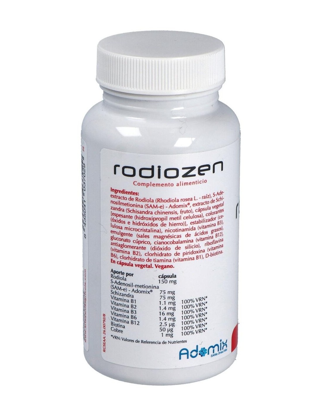 Extracto de Rodiola (Rhodiola rosea L. - raíz), S-Adenosil-metionina (SAMe) - Adomix®, extracto de Shizandra (Shisandra chinensis, fruto), cápsula vegetal [espesante (hidroxipropil metil celulosa), colorantes (óxidos e hidróxidos de hierro)], estabilizador (celulosa microcristalina), nicotinamida (vitamina B3), emulgente (sales magnésicas de ácidos grasos), gluconato cúprico, cianocobalamina (vitamina B12), antiaglomerante (dióxido de silicio), riboflavina (vitamina B2), clorhidrato de piridoxina (vitamina B6), clorhidrato de tiamina (vitamina B1), D-biotina.