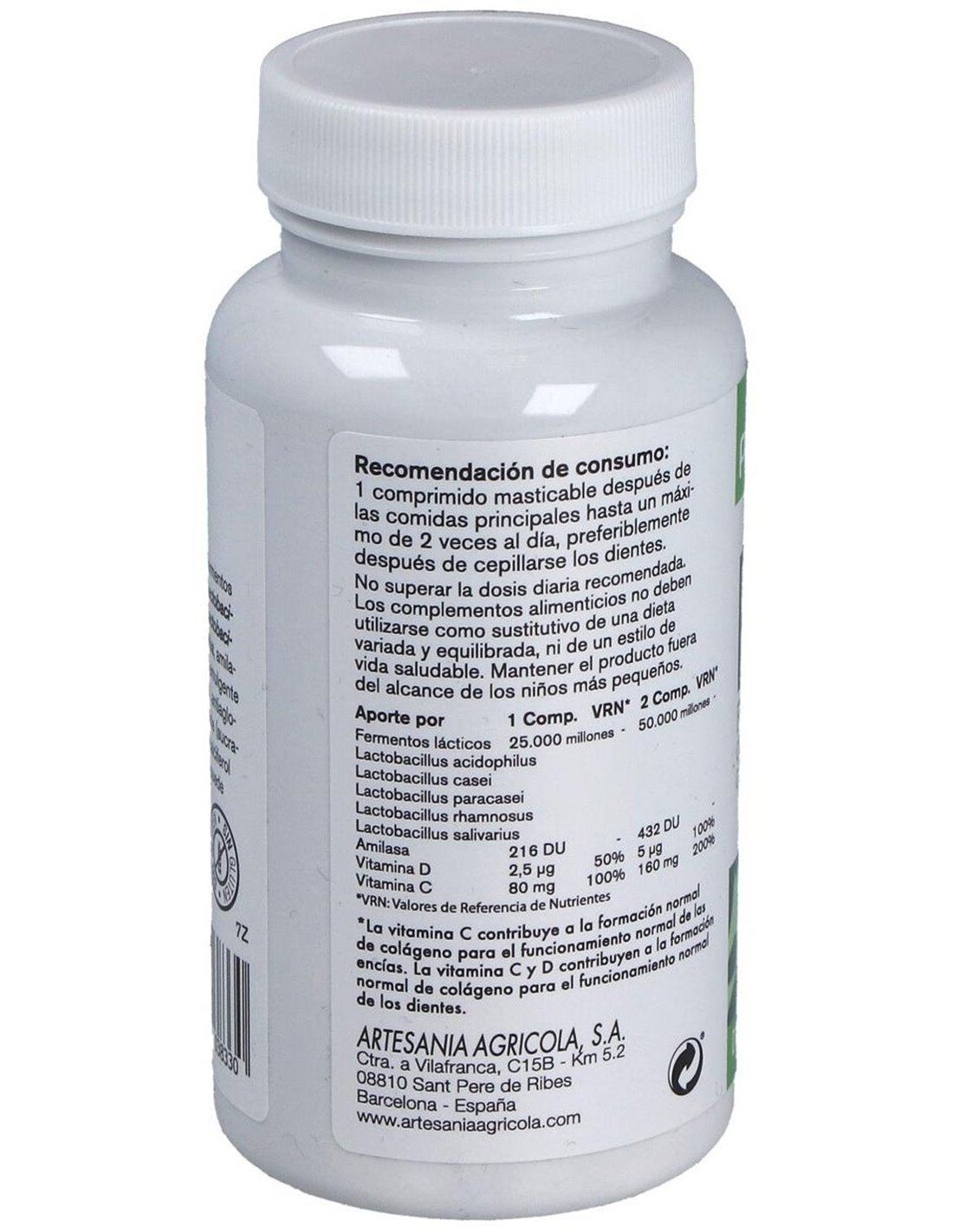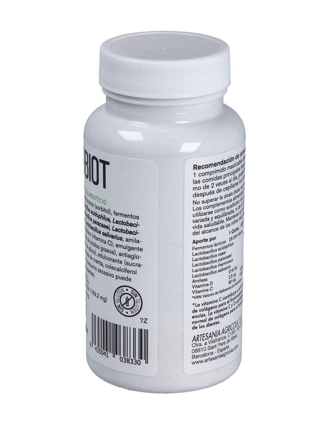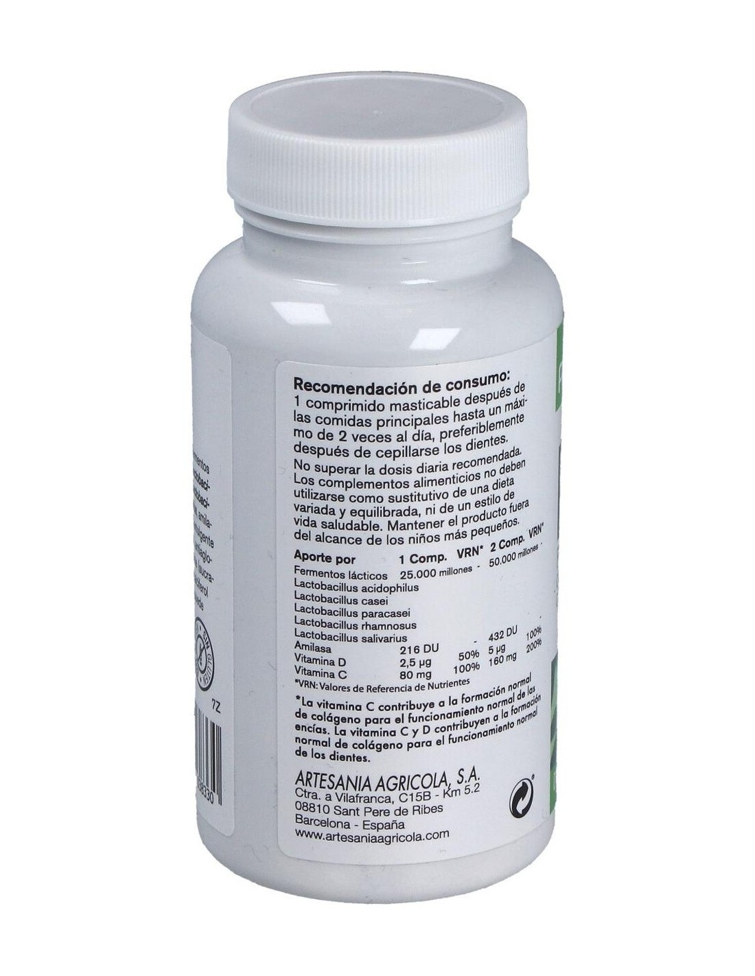 Edulcorante (sorbitol), fermentos lácticos: Lactobacillus acidophilus, Lactobacillus casei, Lactobacillus paracasei, Lactobacillus rhamnosus, Lactobacillus salivarius, amilasa, L-ascorbato cálcico (vitamina C), emulgente (sales magnésicas de ácidos grasos), antiaglomerante (dióxido de silicio), edulcorante (sucralosa), aceite esencial de menta, colecalciferol (vitamina D3).