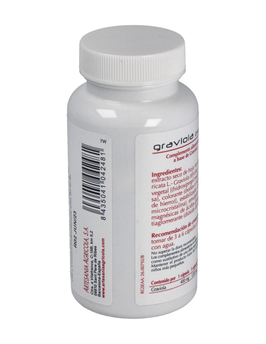 Extracto Seco De Hoja Annona Muricata L.-Graviola (69,6%), Cápsula Vegetal, Colorante, Estabilizador (Celulosa Microcristalina); Emulgente (Sales Magnésicas De Ácidos Grasos), Antiaglomerante (Dióxido De Silicio).
