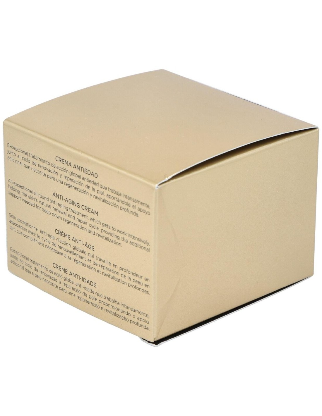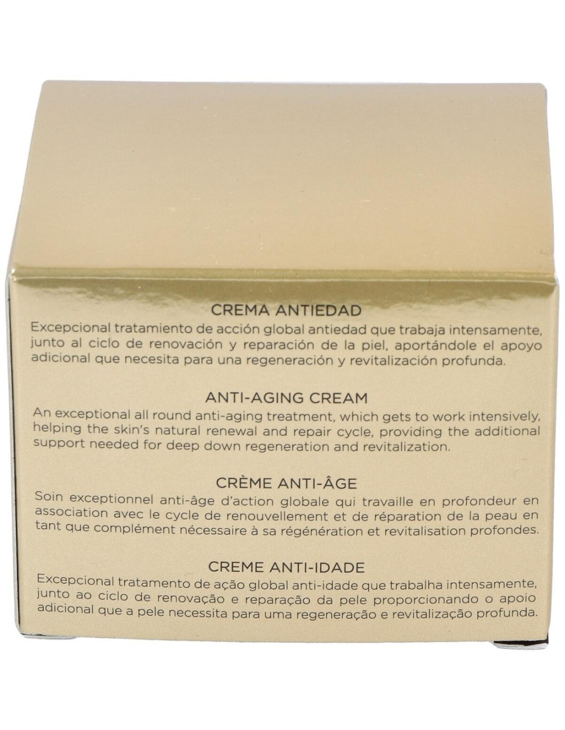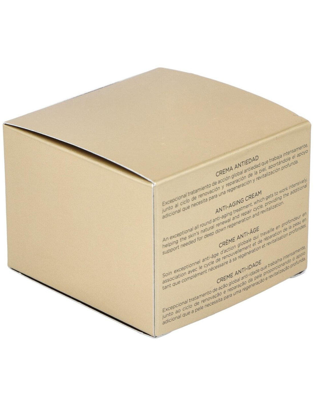 Potente tratamiento rejuvenecedor con sistema triple acción de antienvejecimiento global. En primer lugar, trabaja intensamente a nivel celular, junto al ciclo de renovación y reparación de la piel, retrasando el envejecimiento gracias a sus activos promotores de la telomerasa y protectores del ADN. Por otra parte, mejora la matriz extracelular, rejuveneciendo las células estructurales de la dermis y estimulando la síntesis de colágeno, lo que aporta tersura, volumen y firmeza. Por último, refuerza la epidermis, interviniendo en los mecanismos naturales de hidratación epidérmica, recuperando la elasticidad, la suavidad y el equilibrio cutáneo.