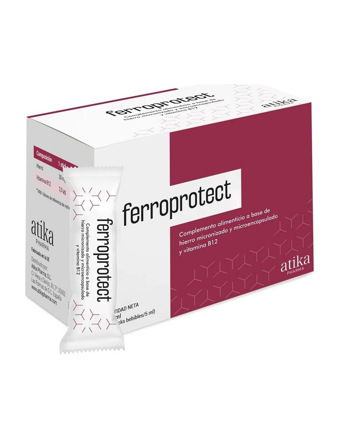 ATIKAComplemento alimenticio a base de hierro micronizado y microencapsulado y vitamina B12, con una excelente absorción y tolerancia. Formulado en cómodos sticks bebibles, para tomar en cualquier momento y lugar, sin necesidad de agua. Su excelente sabor ha sido reconocido en premios internacionales. La tecnología avanzada por la que el hierro de Ferroprotect es sometido a un proceso de micronizado (se reduce el tamaño de partícula) y microencapsulado (las partículas se introducen dentro de unas esferas microscópicas formadas por ácidos grasos) hace que tenga una óptima tolerabilidad gastrointestinal y mayor absorción. \ El hierro contribuye a la formación normal de glóbulos rojos y de hemoglobina, al transporte normal de oxígeno en el cuerpo y a disminuir el cansancio y la fatiga, así como a mantener una función normal del sistema inmunitario, del sistema nervioso y a mantener una función cognitiva normal entre otras funciones fisiológicas. Producto apto para veganos.