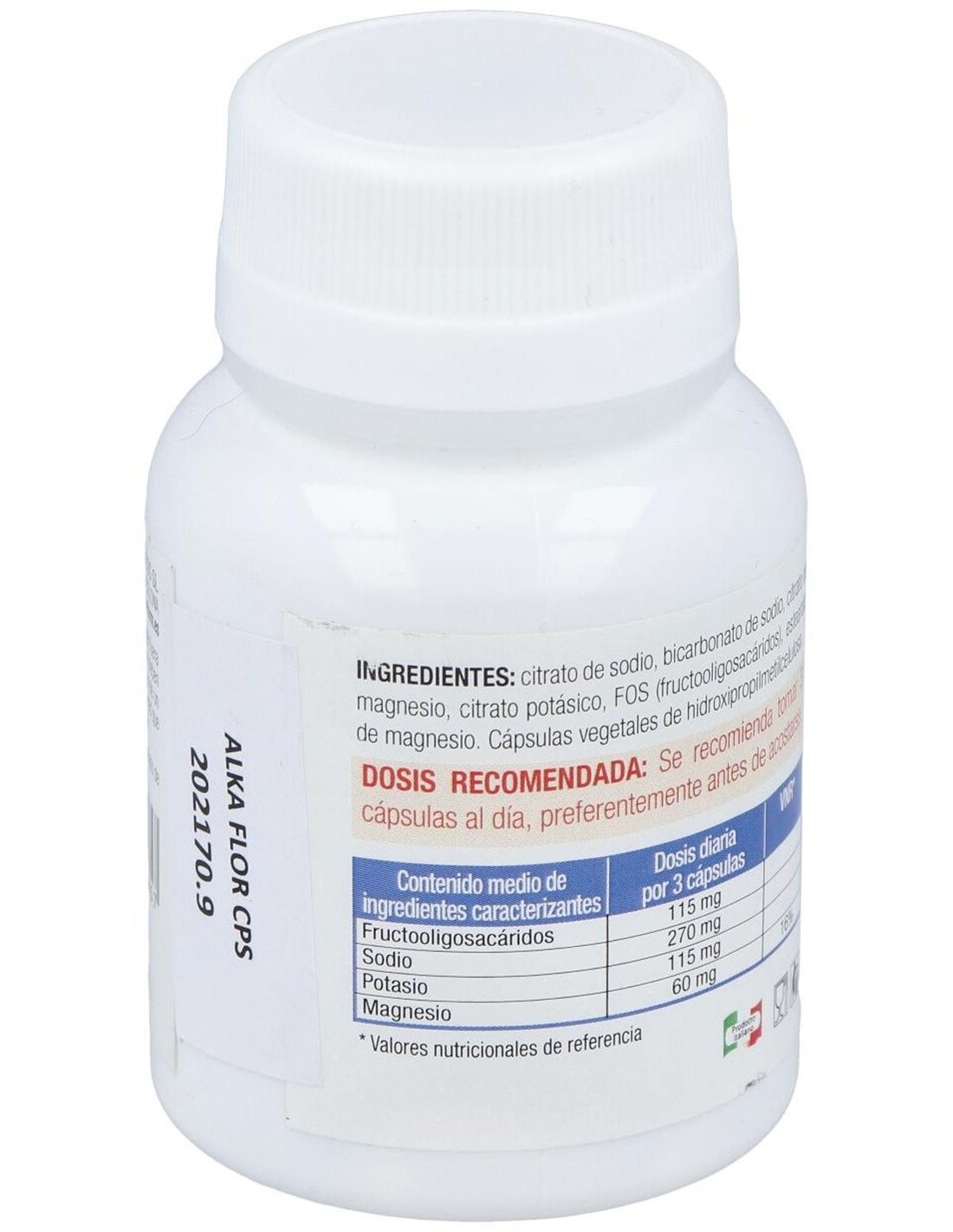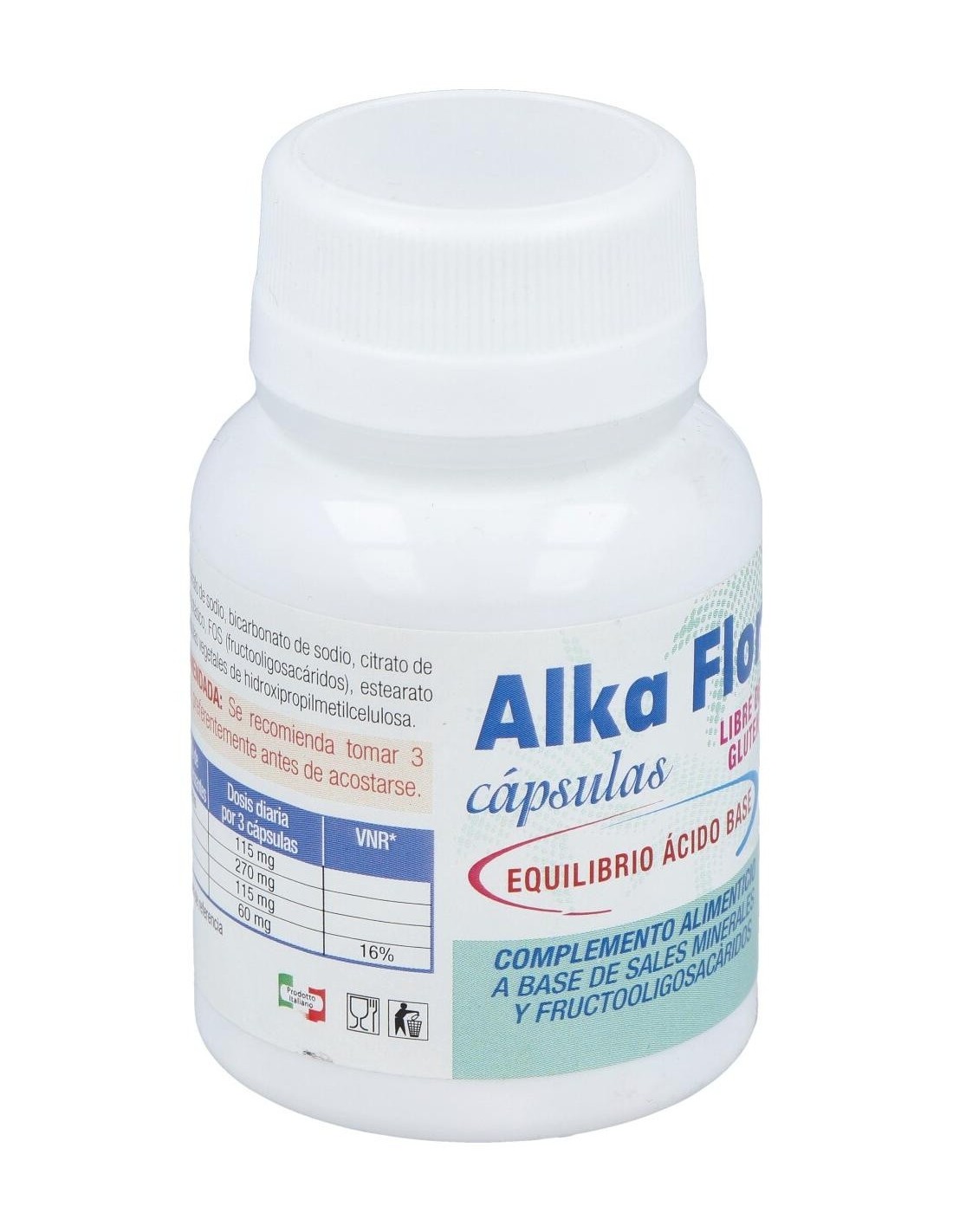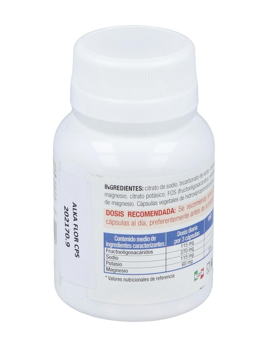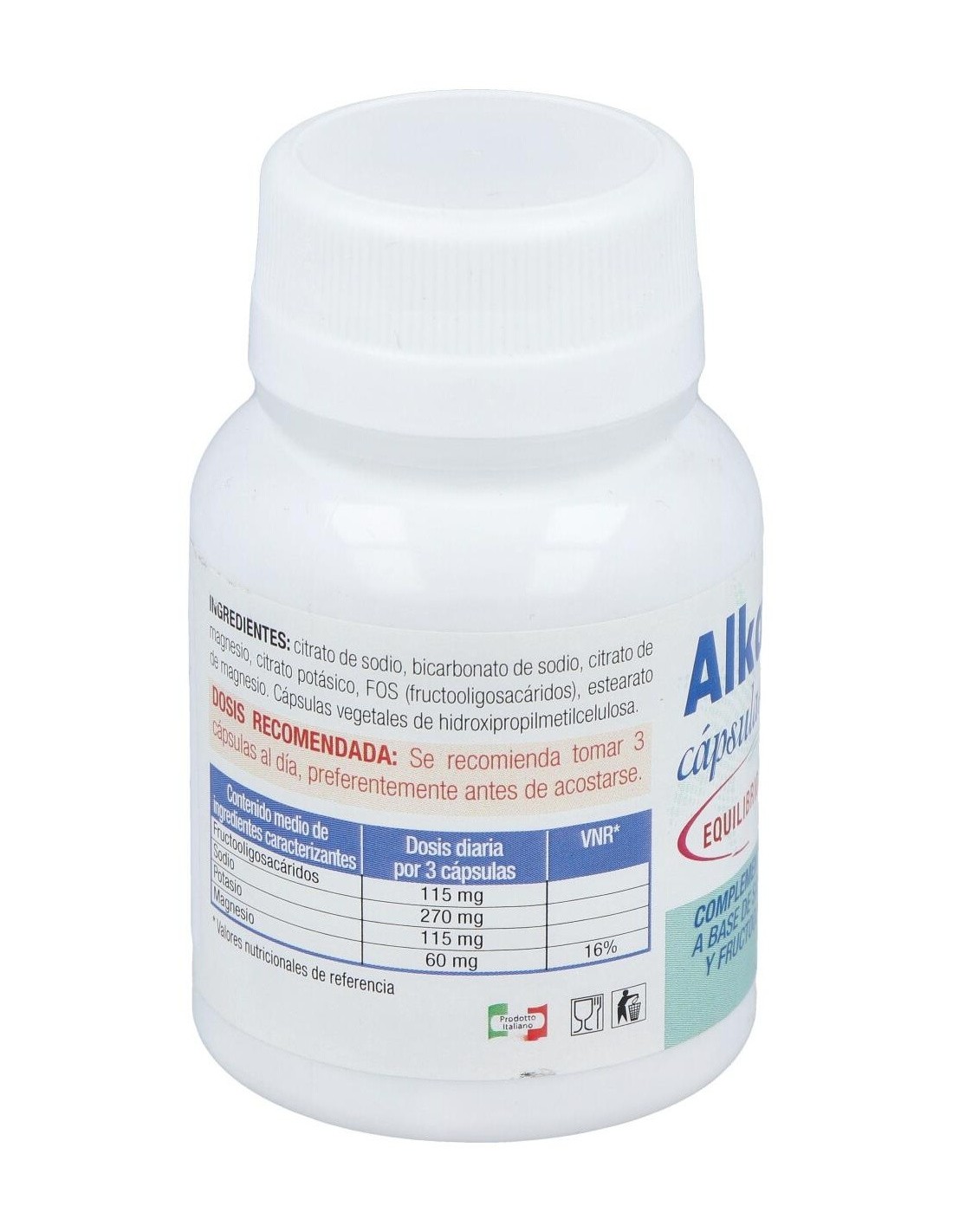 Citrato de sodio, Bicarbonato de sodio, Citrato de magnesio, Citrato de potasio, Fructooligosacáridos (FOS), Estearato de magnesio, cápsula vegetal de hidroxipropilmetilcelulosa.
