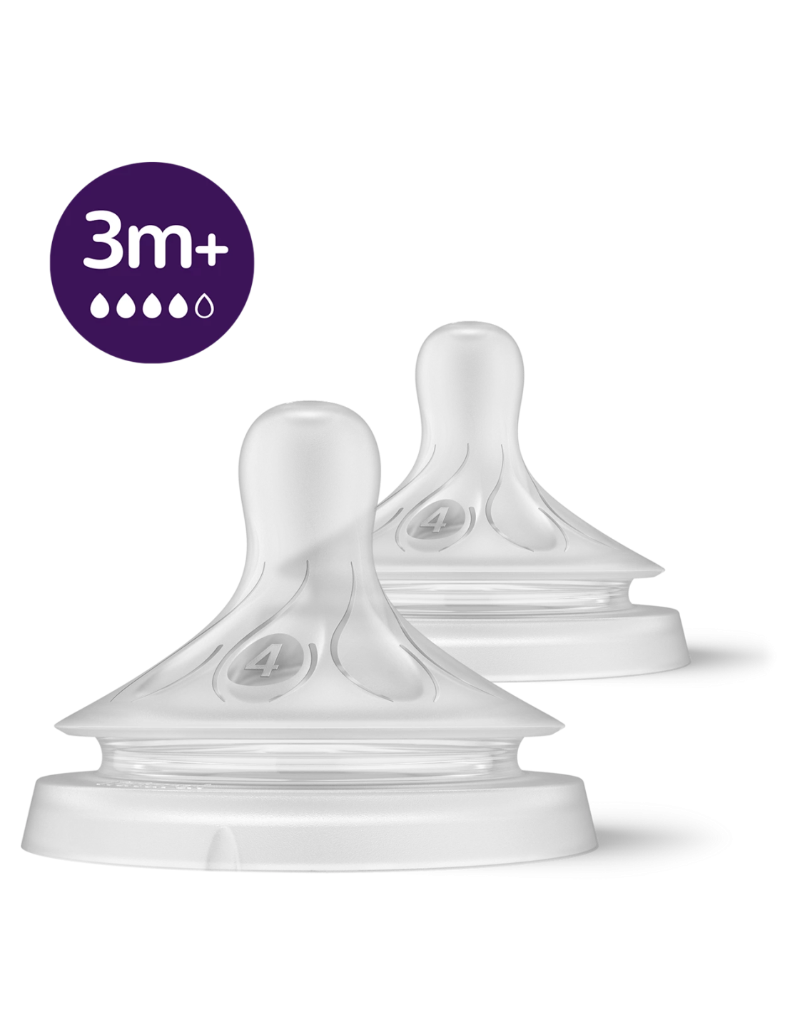 La tetina Natural Response sólo libera leche cuando el bebé succiona activamente. Los bebés pueden beber, tragar y respirar siguiendo su ritmo natural, como con el pecho. Esto facilita la combinación de la lactancia materna con el biberón. La tetina ancha, suave y flexible está diseñada para imitar la forma y la textura del pecho, lo que ayuda al bebé a engancharse y a alimentarse cómodamente. A partir de 3 meses.