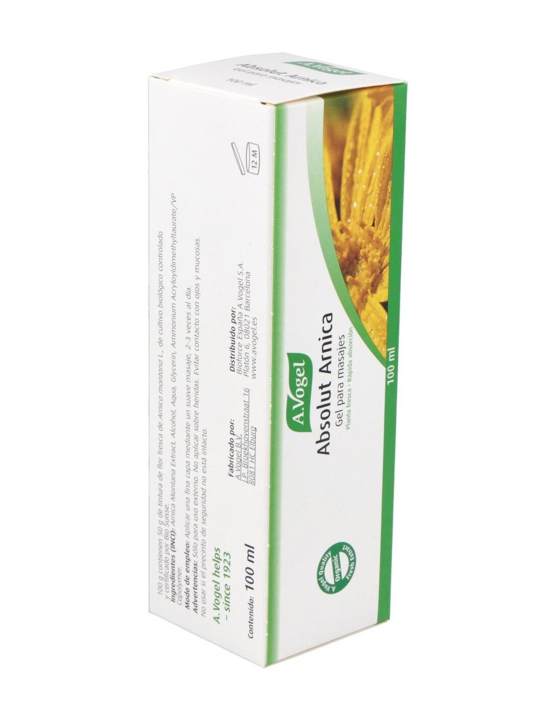 Las flores amarillas frescas de árnica montana son de cultivo biológico, recogidas a mano y maceradas con alcohol y agua para crear la tintura base para la fabricación del gel A. Vogel Absolut Arnica.