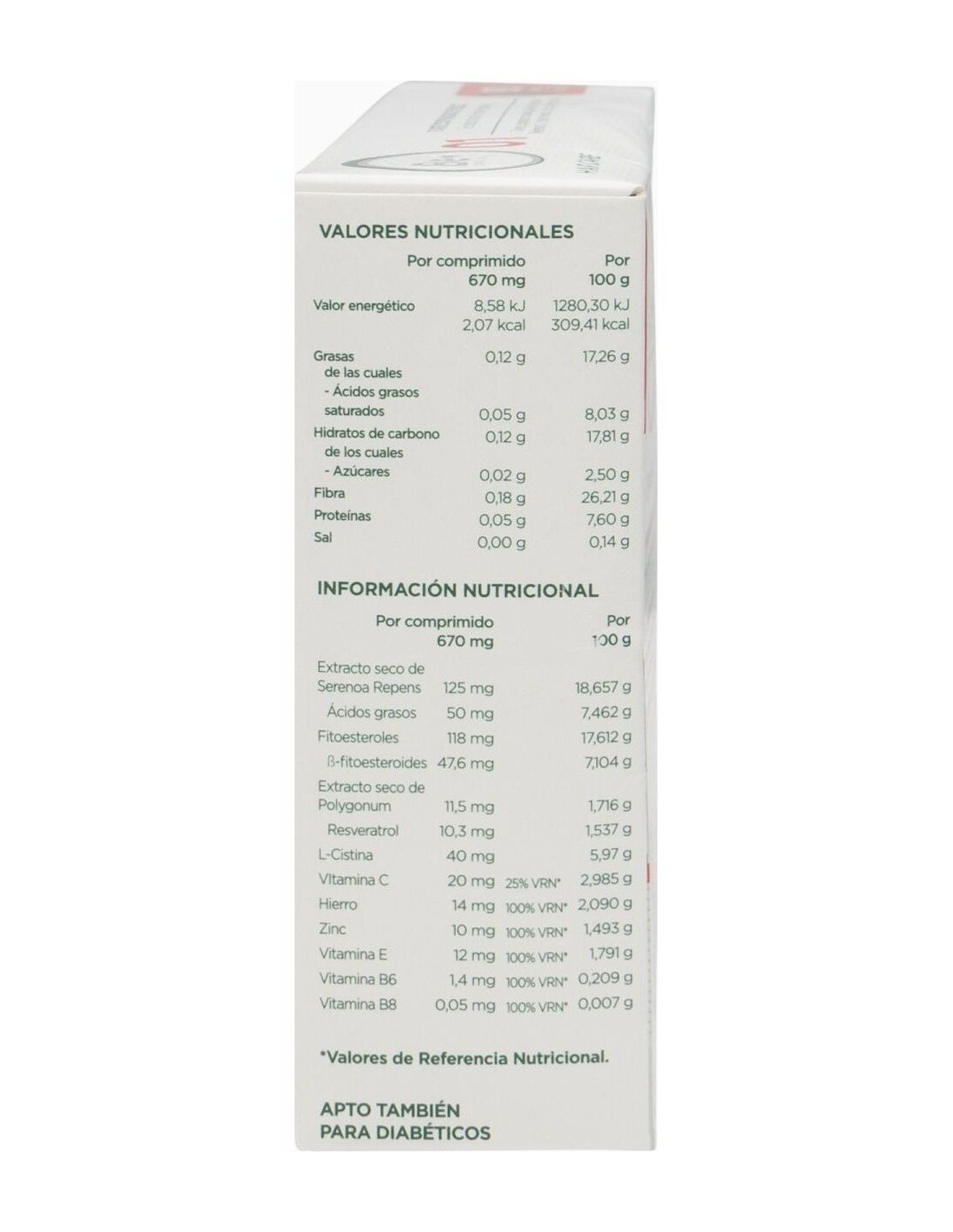 BE+Formulación con elevada concentración de Serenoa Repens junto a Fitoesteroles y Resveratrol y 4 vitaminas junto al Hierro, Zinc, L-Cistina, recomendado para la caída del cabello en situación de antecedentes familiares y menopausia y caída en la zona superior de la cabeza. La biotina contribuye a mantener el cabello en condiciones normales. Las vitamina C y E tiene propiedades antioxidantes. Apto para diabéticos.