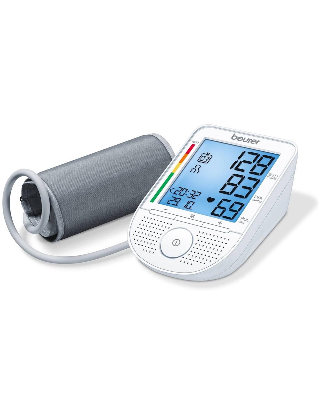 BEURERCon altavoz integrado\ Medición del pulso y la presión arterial totalmente automática en el brazo\ Emisión de voz: GB, E, P, GR\ Volumen regulable, voz desactivable\ Promedio de todos los valores de medición guardados\ Promedio de la presión arterial matutina y vespertina de los últimos 7 días\ Pantalla XL de fácil lectura con retroiluminación azul\ 2 x 60 posiciones de memoria\ Indicador de riesgo\ Detección de arritmias\ Producto sanitario\ Para contornos de brazo de 22 - 36 cm\ Fecha y hora/mecanismo de desconexión automática\ Aviso en caso de errores de aplicación\ Indicación de cambio de pilas\ Bolsa para guardarlo\ Brazalete XL (35 - 44 cm) disponible como accesorio\ Fuente de alimentación disponible por separado