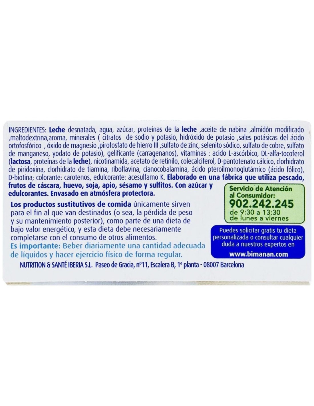 Leche desnatada, agua, azúcar, proteínas de la leche, aceite de nabina, maltodextrina, almidón modificado, aroma, minerales (citratos de sodio y potasio, hidróxido de potasio, sales potásicas del ácido ortofosfórico, óxido de magnesio, pirofosfato de hierro III, sulfato de zinc, selenito sódico, sulfato de cobre, sulfato de manganeso, yodato de potasio), gelificante (carragenanos), vitaminas: ácido L-ascórbico, dl--tocoferol (lactosa, proteínas de leche), nicotinamida, acetato de retinilo, colecalciferol, D-pantotenato de calcio, clorhidrato de piridoxina, clorhidrato de tiamina, riboflavina, cianocobalamina, ác.pteroilmonoglutámico (ác. Fólico), y D biotina, colorante: carotenos, edulcorante: acesulfamo K. Con azúcar y edulcorantes.