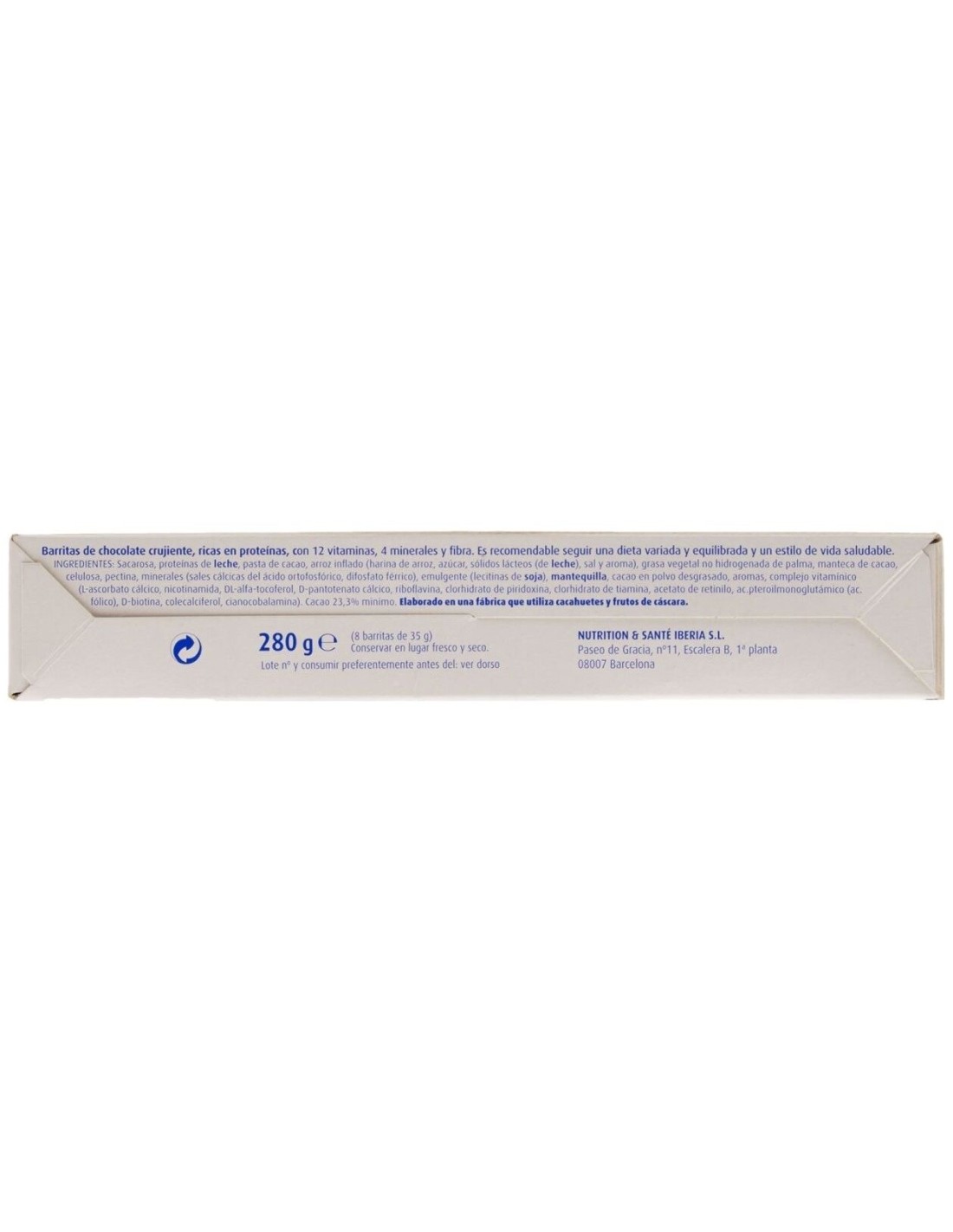 Proteínas de leche, sacarosa, leche desnatada en polvo, jarabe de fructosa, jarabe de glucosa y fructosa, fructooligosacárido, grasa vegetal, arroz inflado (harina de arroz, azúcar, sólidos lácteos, sal y aroma), leche en polvo, aceite vegetal, manteca de cacao, complejo mineral (gluconato potásico, cloruro sódico, fosfato magnésico, difosfato férrico, óxido de zinc, gluconato de cobre (II), sulfato de manganeso, yoduro potásico, seleniato sódico), suero lácteo en polvo, metil celulosa, aromas, emulgente (lecitina de soja), complejo vitaminico (Vitamina C, niacina, vitamina E, ác. pantoténico, vitamina B2, vitamina, B6, vitamina B1, vitamina A, ácido fólico, biotina, vitamina D, vitamina B12), antioxidantes (E-307, E-308, E-309). *Puede contener trazas de gluten.