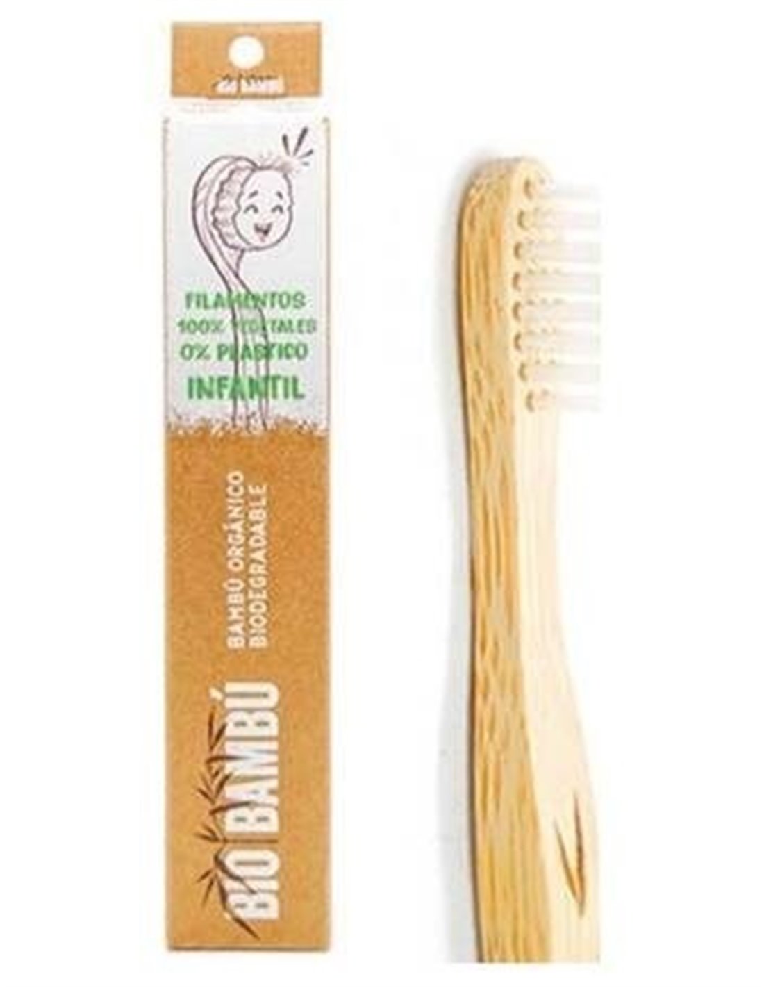 Cepillo de dientes infantil de bambú con dureza suave, el diseño del cepillo presenta mango de bambú ecológico y filamentos 100% vegetales, ingredientes con certificación eco de USDA. BioBambú es una alternativa sostenible al cepillo de dientes de plástico convencionales.