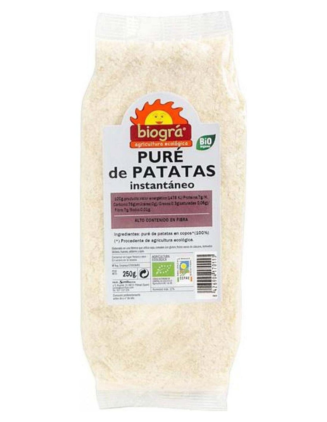 Copos de patatas para puré instantáneo, elaborado con ingredientes de cultivos ecológicos. A base de patatas cocidas, enfriadas y deshidratadas. Es un alimento rico en carbohidratos, agua, potasio, vitamina C, vitamina B, ácido fólico, hierro y magnesio. Es un producto vegano libre de modificaciones genéticas. No contiene gluten, sal, azúcar ni lactosa.