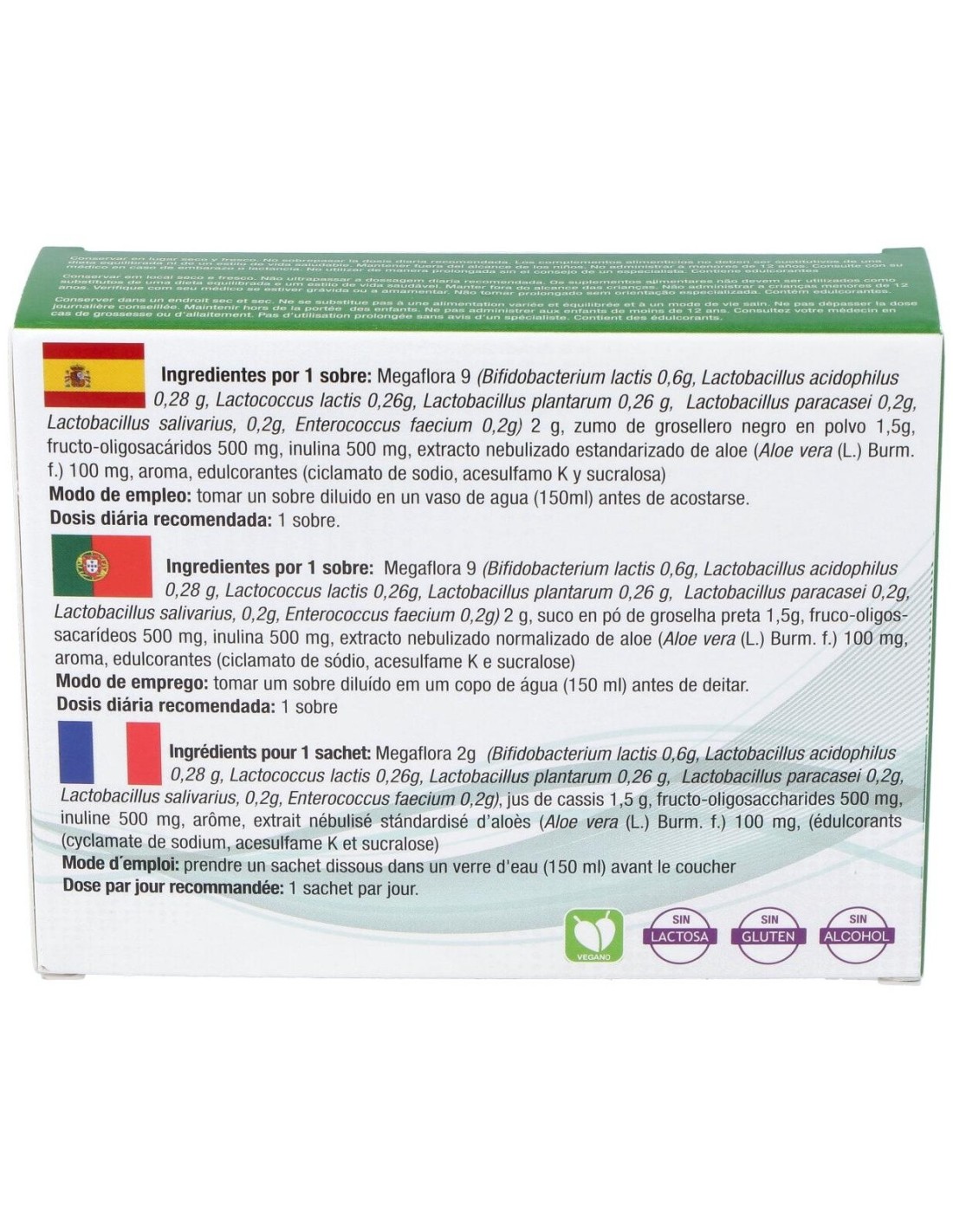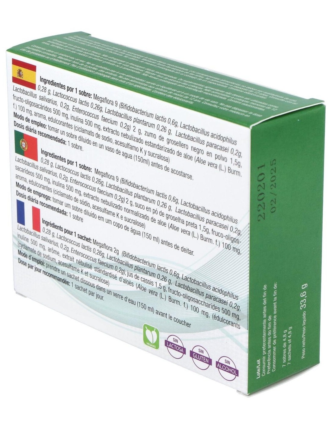 Megaflora 9 (Lactobacillus lactis, Lactobacillus paracasei, Lactobacilus plantarum, Lactobacillus acidophilus, Lactobacilus salivarius, Bifidobacterium lactis, Enterococcus faecium) 2 g, zumo de grosellero negro en polvo 1,5g, fructo-oligosacáridos 500 mg, inulina 500 mg, extracto nebulizado estandarizado de aloe (Aloe vera (L.) Burm.f.) 100 mg, aroma, edulcorantes (ciclamato de sodio, acesulfamo K y sucralosa)