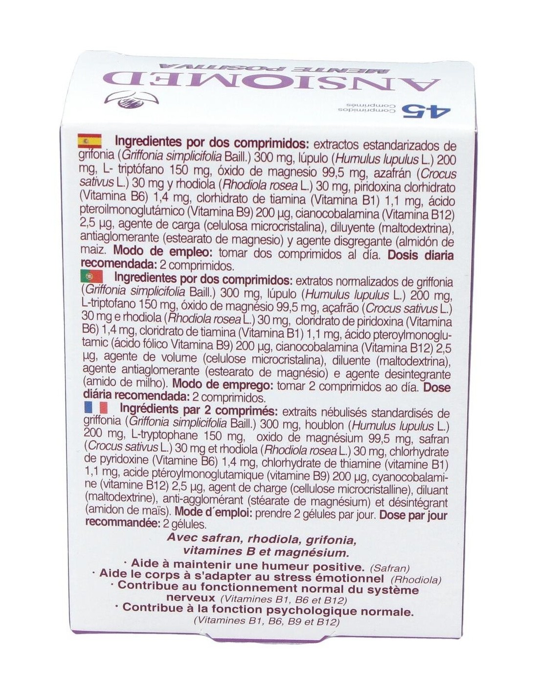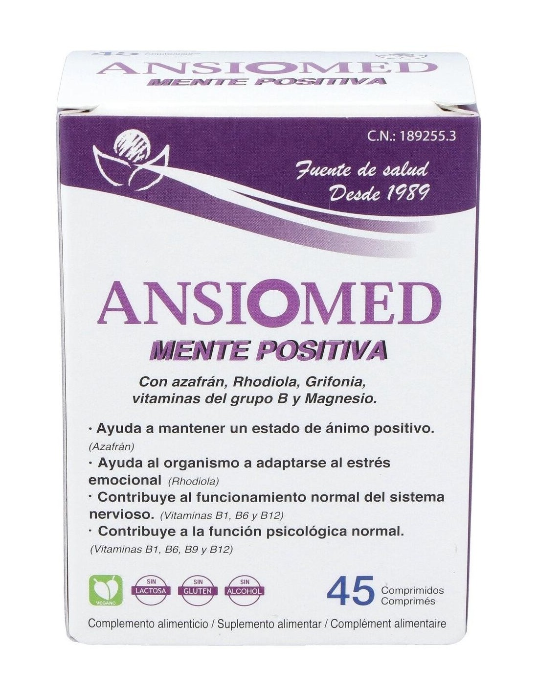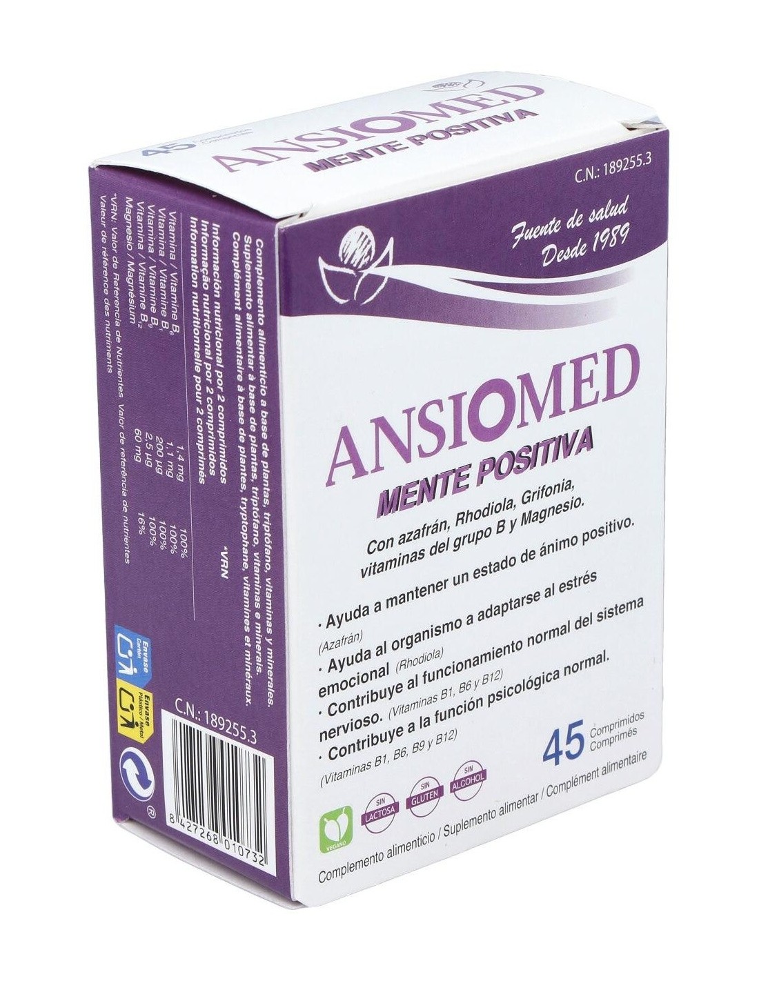 Ansiomed Mente Positiva 45comp es un complemento alimenticio a base de azafrán, rhodiola, grifonia, magnesio y vitaminas gel grupo B. Ayuda a mantener un estado de ánimo positivo y a reducir las tensiones. Indicado para personas sujetas a estrés.