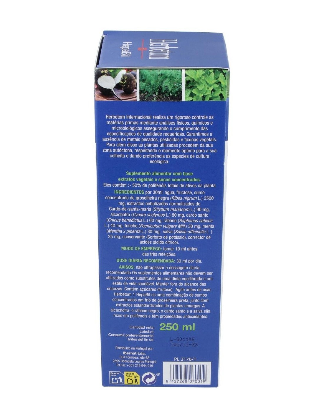 Agua, fructosa, zumo concentrado de grosellero negro (Ribes nigrum L.), extractos nebulizados estandarizados de cardo mariano (Silyibum marianum (L.) Gaertn.) 90 mg, alcachofera (Cynara scolymus L.) 80 mg, cardo santo (Cnicus benedictus L.) 60 mg, rábano negro (Raphanus sativus L.) 40 mg, hinojo (Foeniculum vulgare Miller) 30 mg, menta (Mentha x piperita L.) 30 mg y salvia (Salvia officinalis L.) 25 mg, conservante (sorbato potásico).
