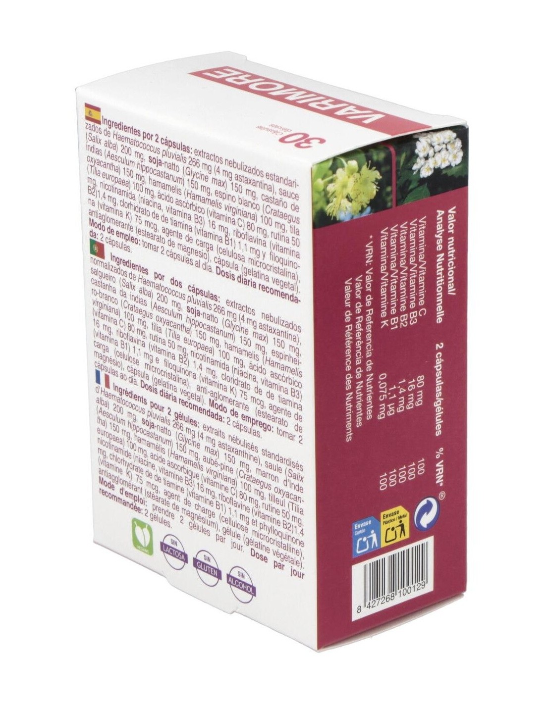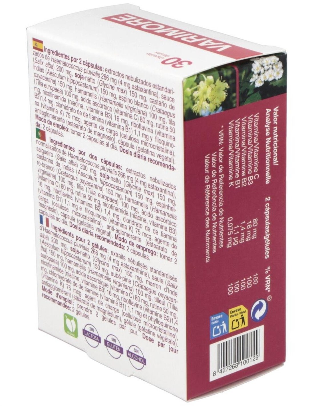Ingredientes por 2 cápsulas: extractos nebulizados estandarizados de Haematococcus pluvialis 266 mg (4 mg astaxantina), sauce (Salix alba) 200 mg, nattokinasa 150 mg, castaño de indias (Aesculum hippocastanum) 150 mg, espino blanco (Crataegus oxyacantha) 150 mg, hamamelis (Hamamelis virginiana) 100 mg, tila (Tilia europaea) 100 mg, ácido ascórbico (vitamina C) 80 mg, rutina 50 mg, nicotinamida (niacina, vitamina B3) 16 mg, riboflavina (vitamina B2)1,4 mg, clorhidrato de de tiamina (vitamina B1) 1,1 mg y filoquinona (vitamina K) 75 mcg, agente de carga (celulosa microcristalina), antiaglomerante (estearato de magnesio), cápsula (gelatina vegetal).