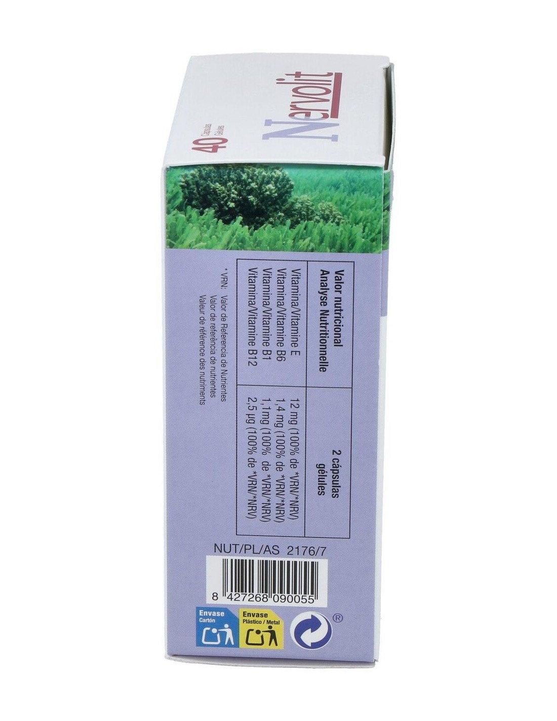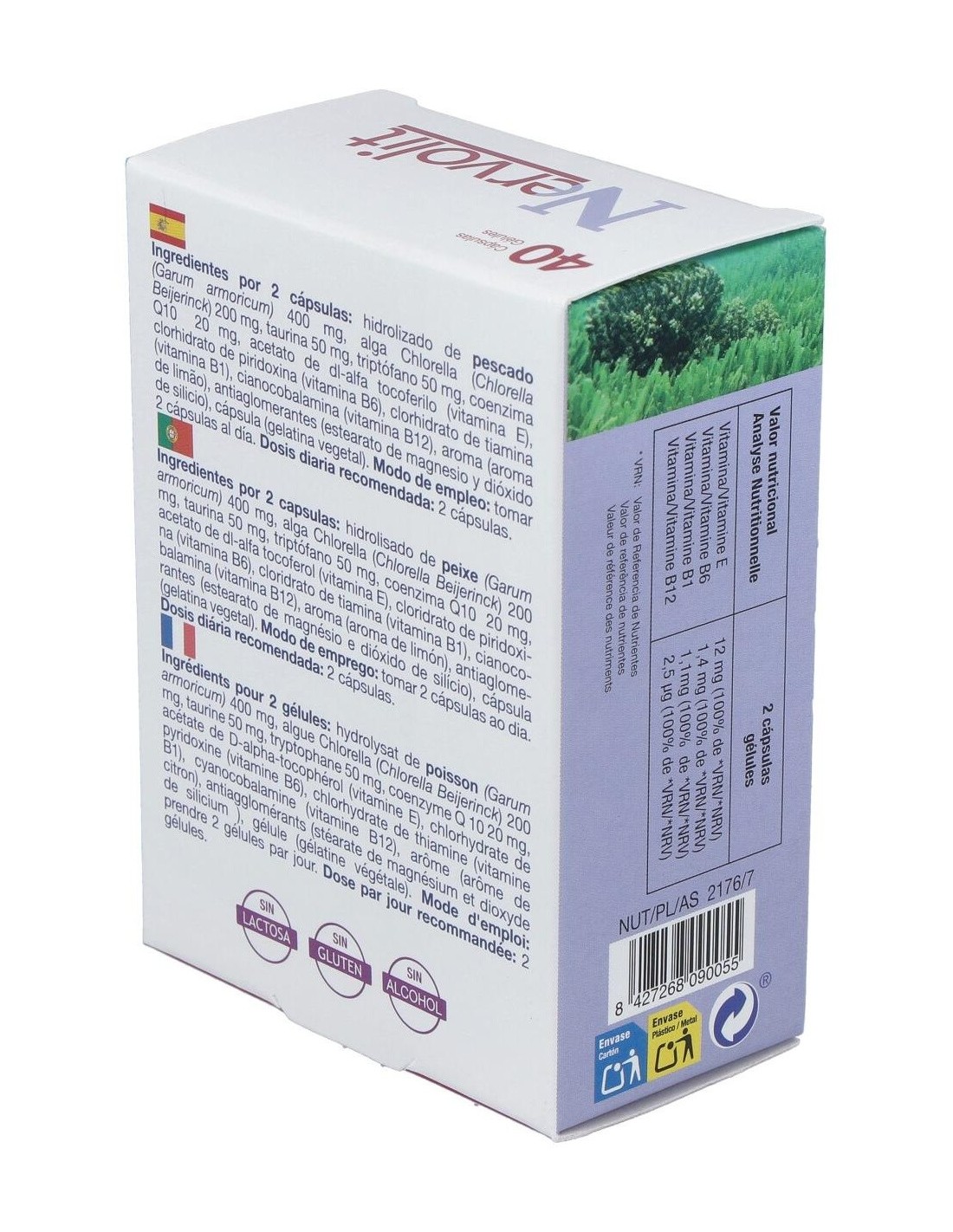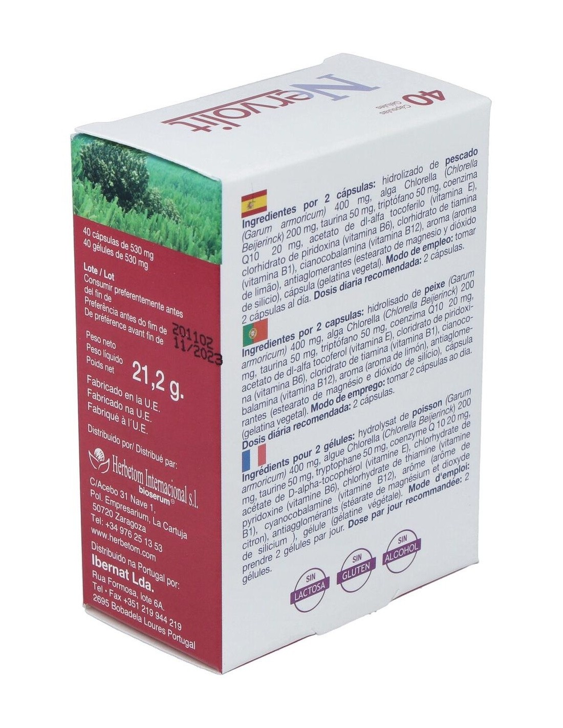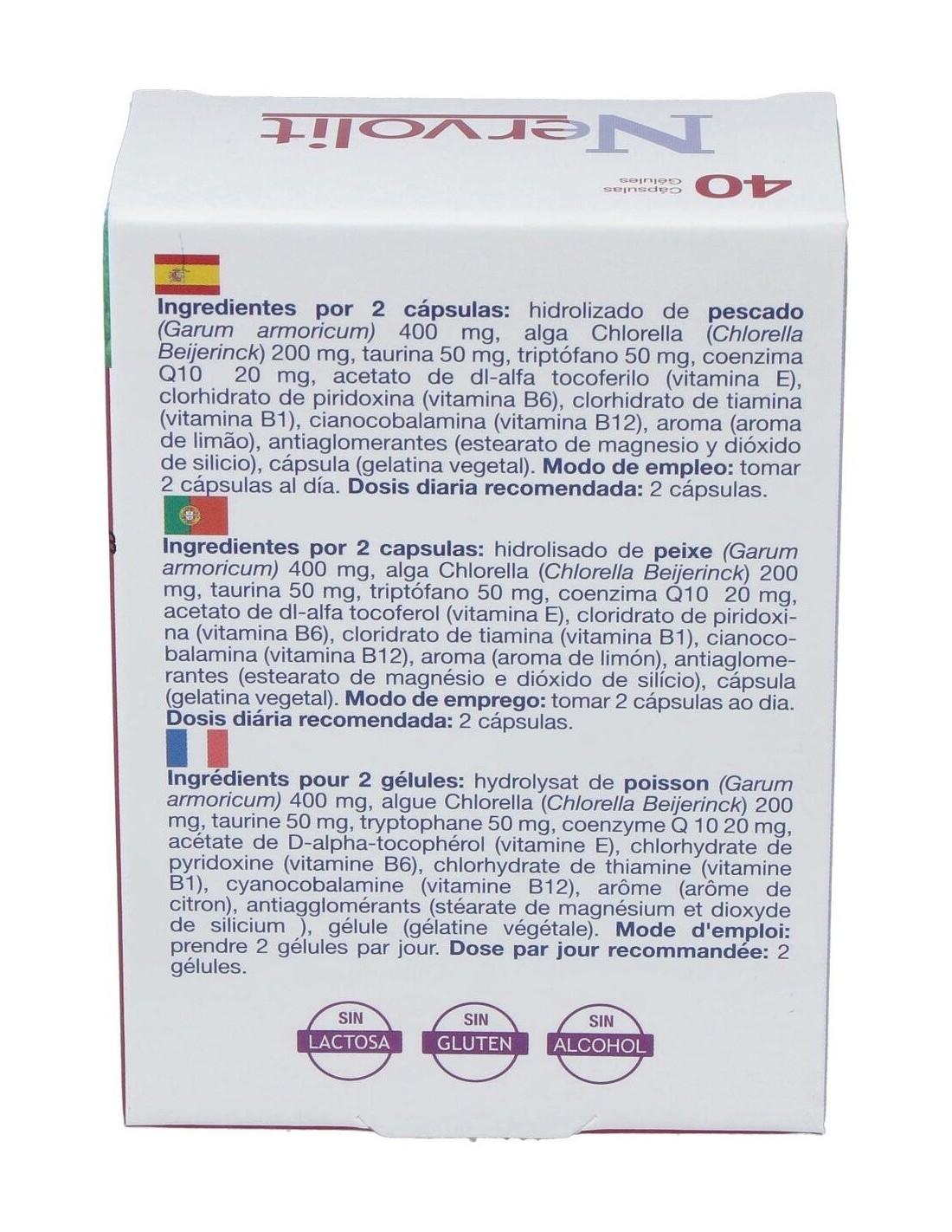 Ingredientes por 2 cápsulas: hidrolizado de pescado (Garum armoricum) 400 mg, alga Chlorella (Chlorella Beijerinck) 200 mg, taurina 50 mg, triptófano 50 mg, coenzima Q10 20 mg, acetato de dl-alfa tocoferilo (vitamina E), clorhidrato de piridoxina (vitamina B6), clorhidrato de tiamina (vitamina B1), cianocobalamina (vitamina B12), aroma (aroma de limão), antiaglomerantes (estearato de magnesio y dióxido de silicio), cápsula (gelatina vegetal).