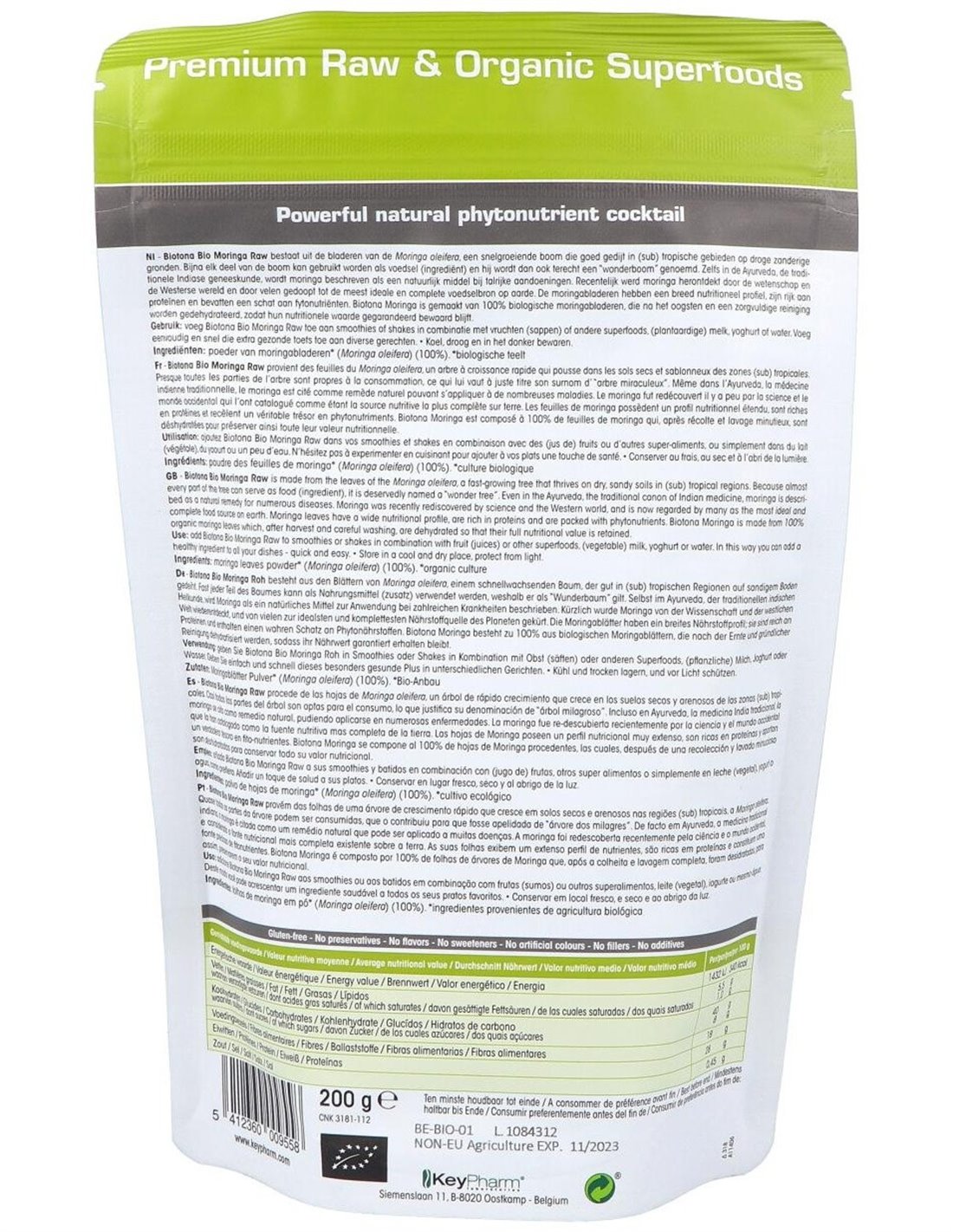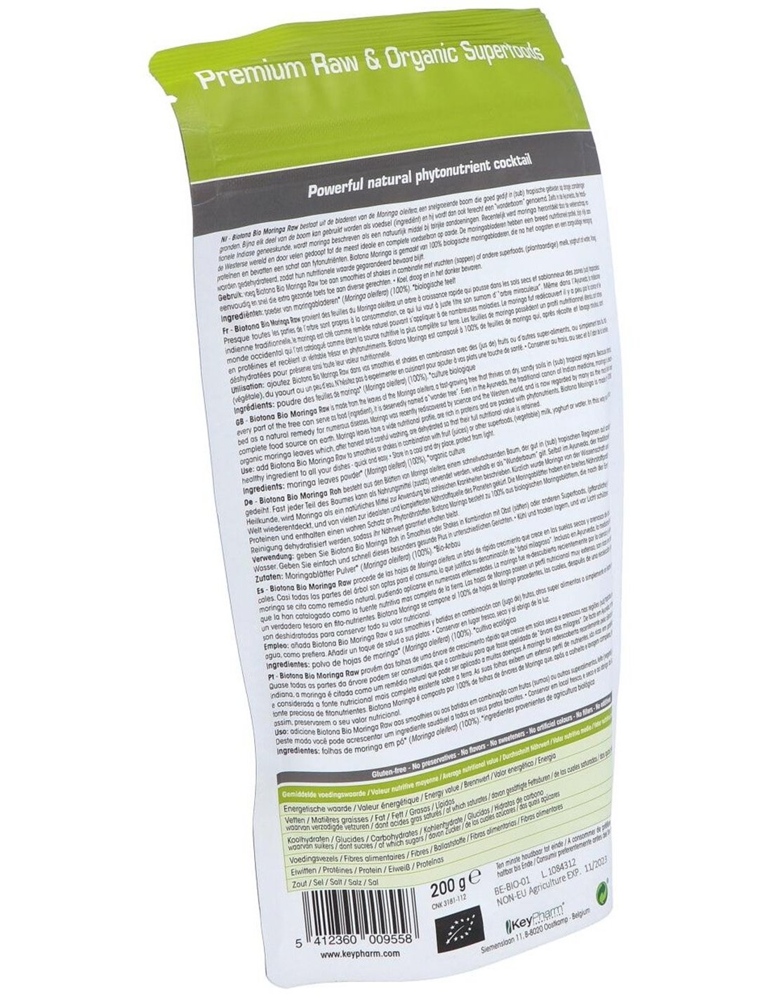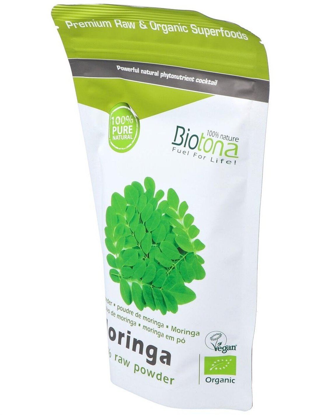 Biotona Moringa se compone al 100% de hojas de Moringa procedentes de África, las cuales, después de una recolección y lavado minucioso son deshidratadas al aire libre y a la sombra para conservar todo su valor nutricional.