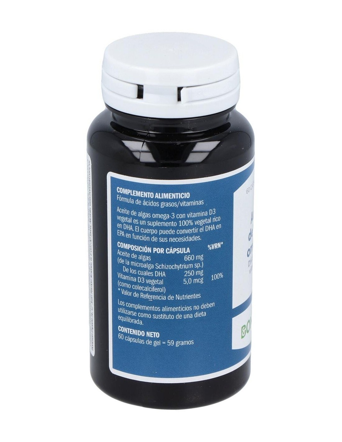 Aceite de algas (625 mg), DHA (250 mg), Vitamina D3 (5 µg).