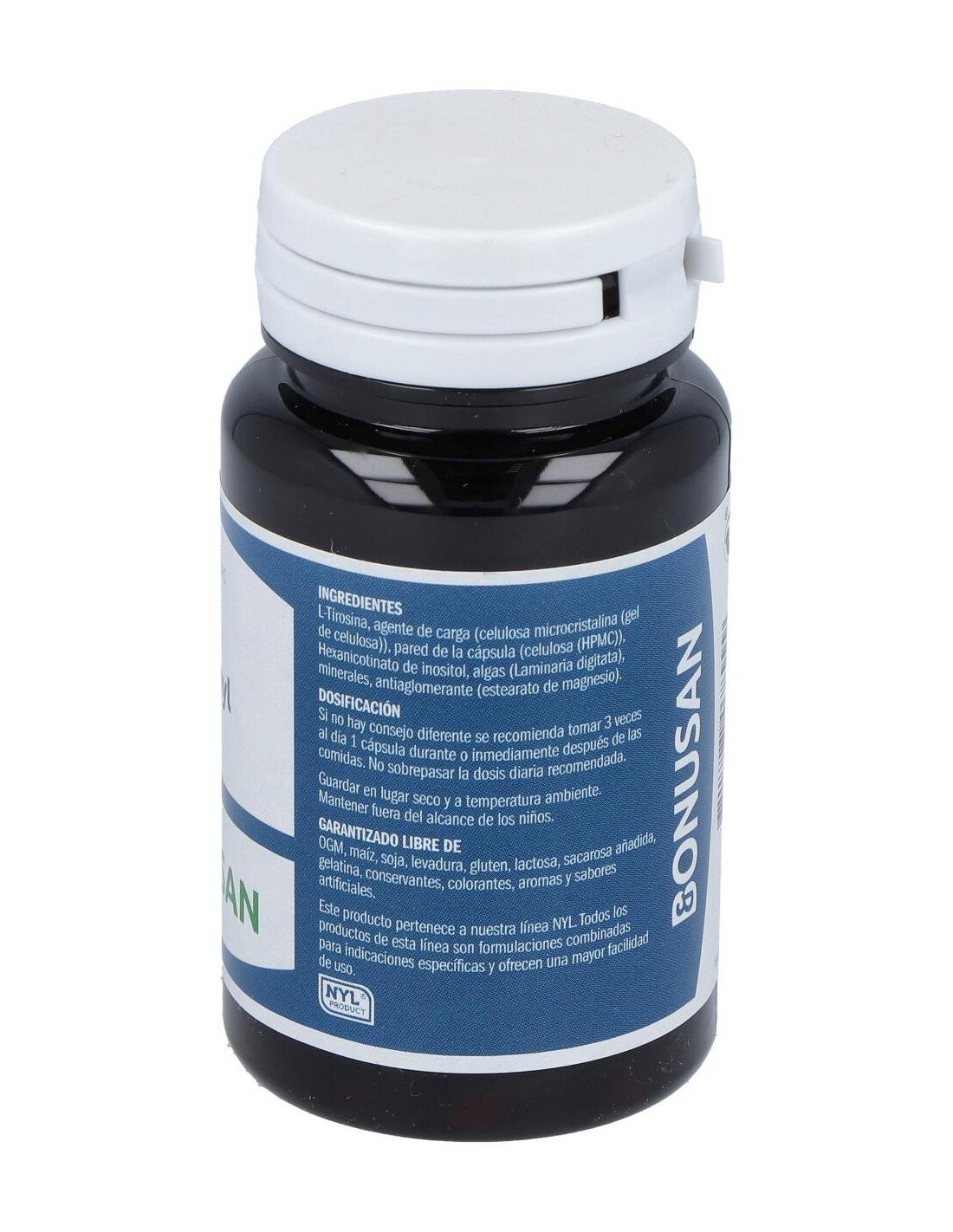 Yodo de Kelp, Selenio (Como Selenio-l-metionina), L-tirosina, Zinc (Como-citrato), Hexanicotinato de Inositol, Agente de carga (Celulosa microcristalina, gel de celulosa), Pared de la cápsula (Celulosa HPMC), Antiaglomerante (Estearato de magnesio).