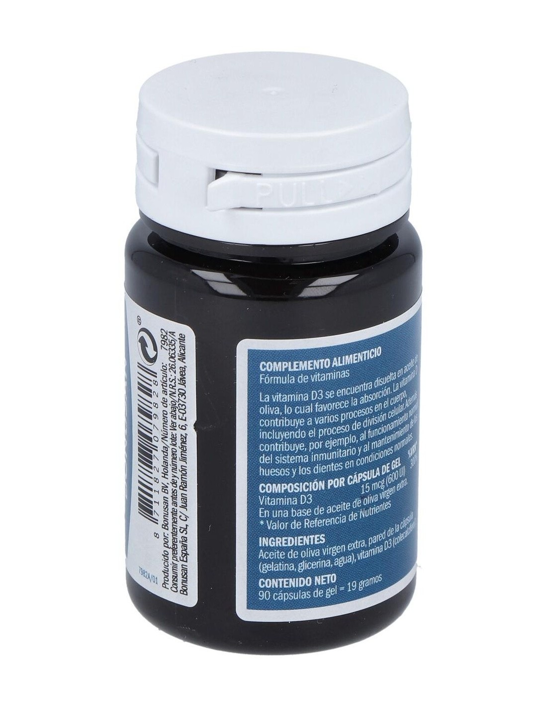 Vitamina D3 75 mcg, En una base de aceite de oliva virgen extra 3000 UI. Sustancias adicionales: Agente de carga (aceite de oliva virgen extra), pared de la cápsula (gelatina, glicerina, agua).